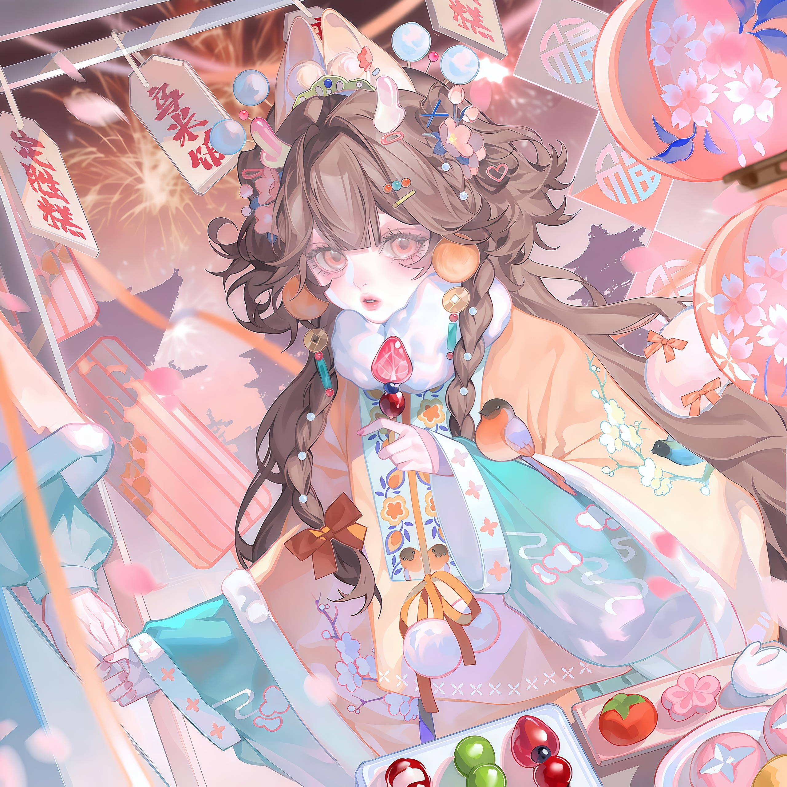 1girl absurdres animal_ears braid brown_eyes brown_hair candy_apple cherry_blossoms fireworks food hair_ornament highres holding holding_food large_variant_set long_hair long_sleeves looking_at_viewer original pom_pom_clothes solo_focus tai01 twin_braids variant_set wide_sleeves