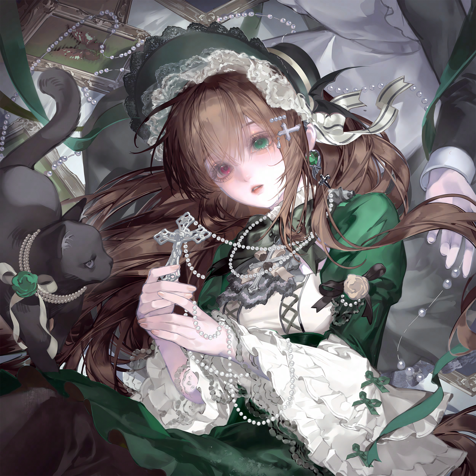 1girl accurate_lolita_coord beads black_cat bonnet bow brown_hair cat cross dress earrings flower frills green_bow green_dress green_eyes green_ribbon hair_between_eyes hair_ornament hat heterochromia highres holding jewelry lolita_fashion long_hair long_sleeves looking_at_viewer lying necklace original parted_lips pearl_necklace red_eyes ribbon solo_focus suiseiseki tai01 wide_sleeves