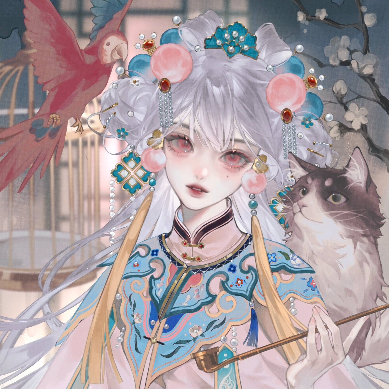 1girl bird branch cat flower hair_ornament hair_rings highres holding jewelry large_variant_set long_hair looking_at_viewer original red_eyes solo tai01 upper_body variant_set white_hair