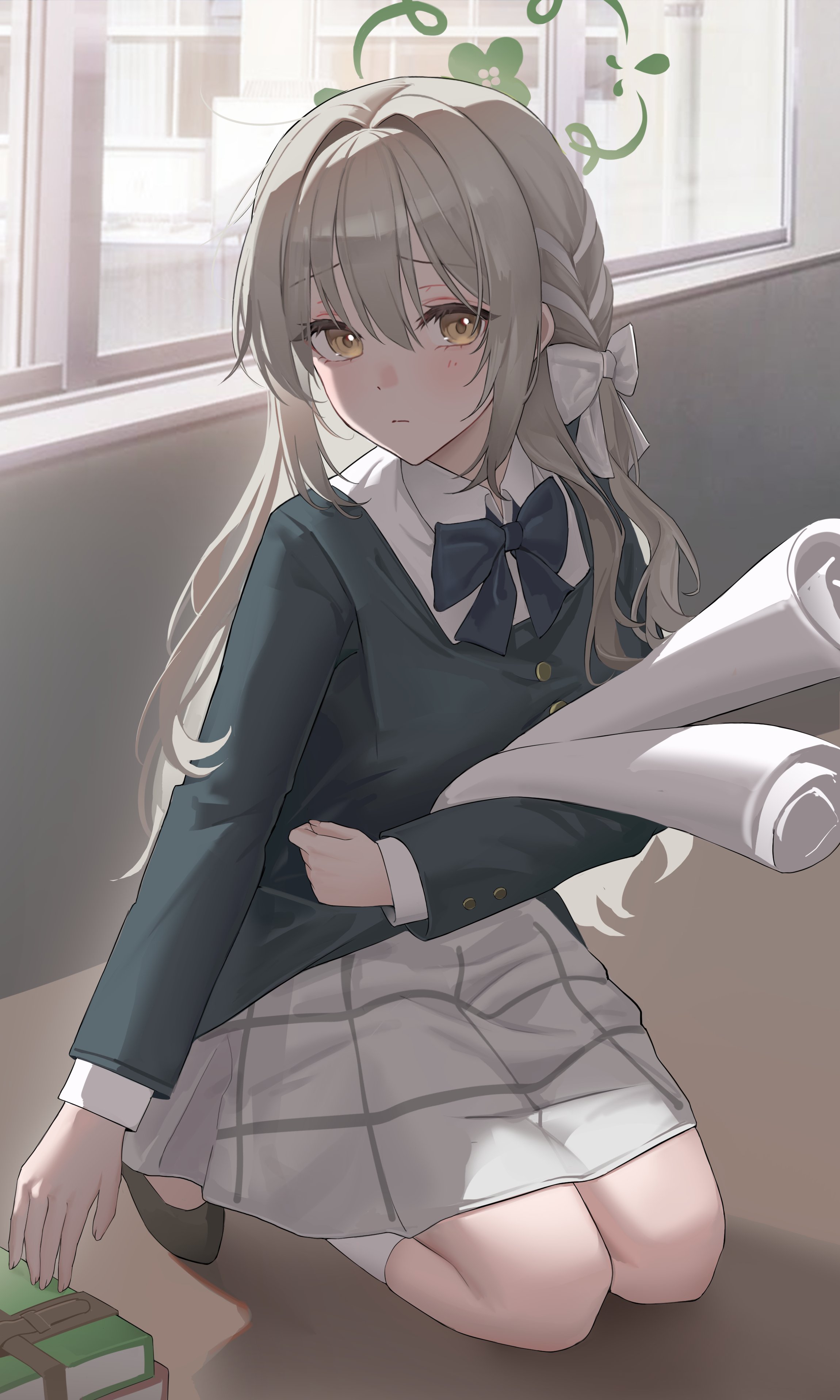 1girl absurdres blazer blue_archive blue_bow book bow bowtie braid collar collared_shirt dot_nose ggoong_(pooplambgoong22) green_halo grey_hair hair_between_eyes hair_bow hair_intakes halo highres holding indoors jacket long_hair looking_at_viewer miyo_(blue_archive) plaid_clothes plaid_skirt seiza shirt sidelocks sitting skirt socks white_bow white_collar white_shirt white_skirt white_socks white_streaks window yellow_eyes