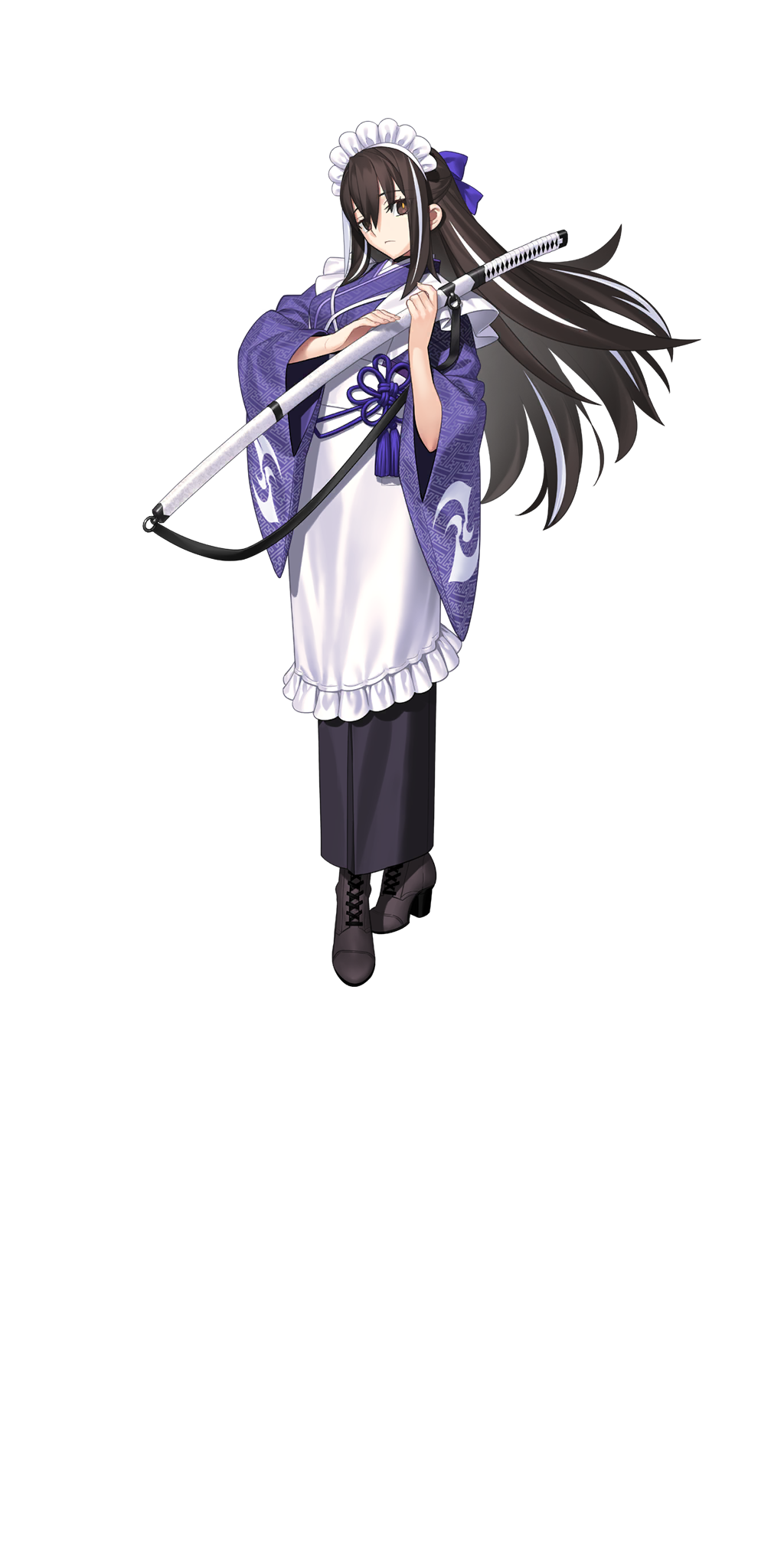 1girl apron boots brown_eyes brown_hair fate/grand_order fate_(series) frilled_apron frills full_body half_updo highres holding holding_sword holding_weapon japanese_clothes katana kawakami_gensai_(fate) kawakami_gensai_(second_ascension)_(fate) kimono large_variant_set long_hair long_sleeves looking_at_viewer maid maid_apron maid_headdress multicolored_hair official_art purple_kimono purple_ribbon ribbon solo standing streaked_hair sword tachi-e takeuchi_takashi third-party_source transparent_background two-tone_hair variant_set wa_maid weapon white_apron white_hair wide_sleeves