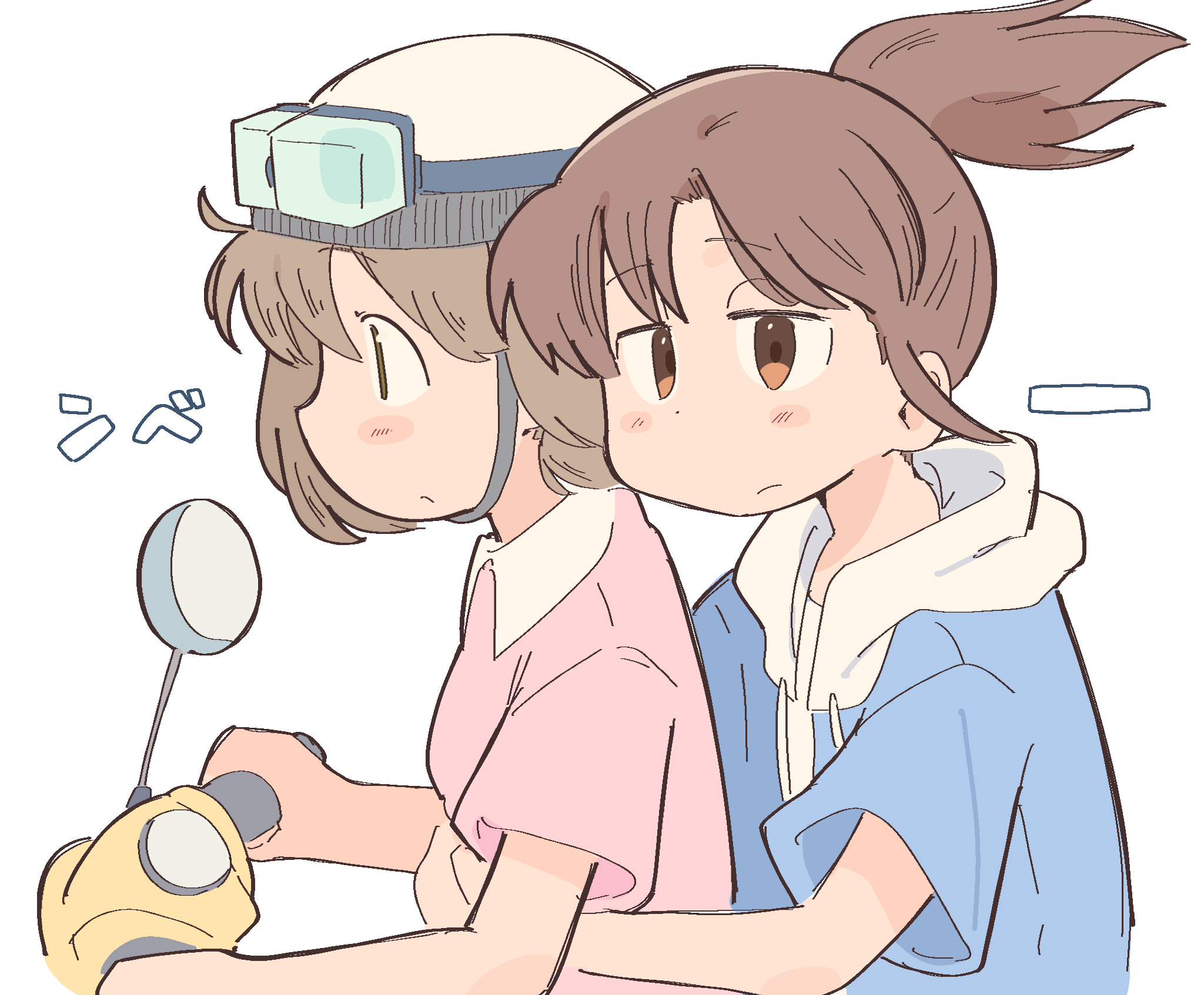 2girls niikura_(city) blonde_hair blue_hoodie blush_stickers brown_eyes brown_hair city_(arawi_keiichi) closed_mouth collared_shirt driving floating_hair from_side hands_on_another's_chest helmet highres hood hood_down hoodie looking_ahead looking_at_viewer medium_hair motor_vehicle multiple_girls nagumo_midori on_scooter pink_shirt ponytail profile riding_scooter scooter shirt short_hair short_sleeves sidelocks simple_background translation_request white_background wichimi