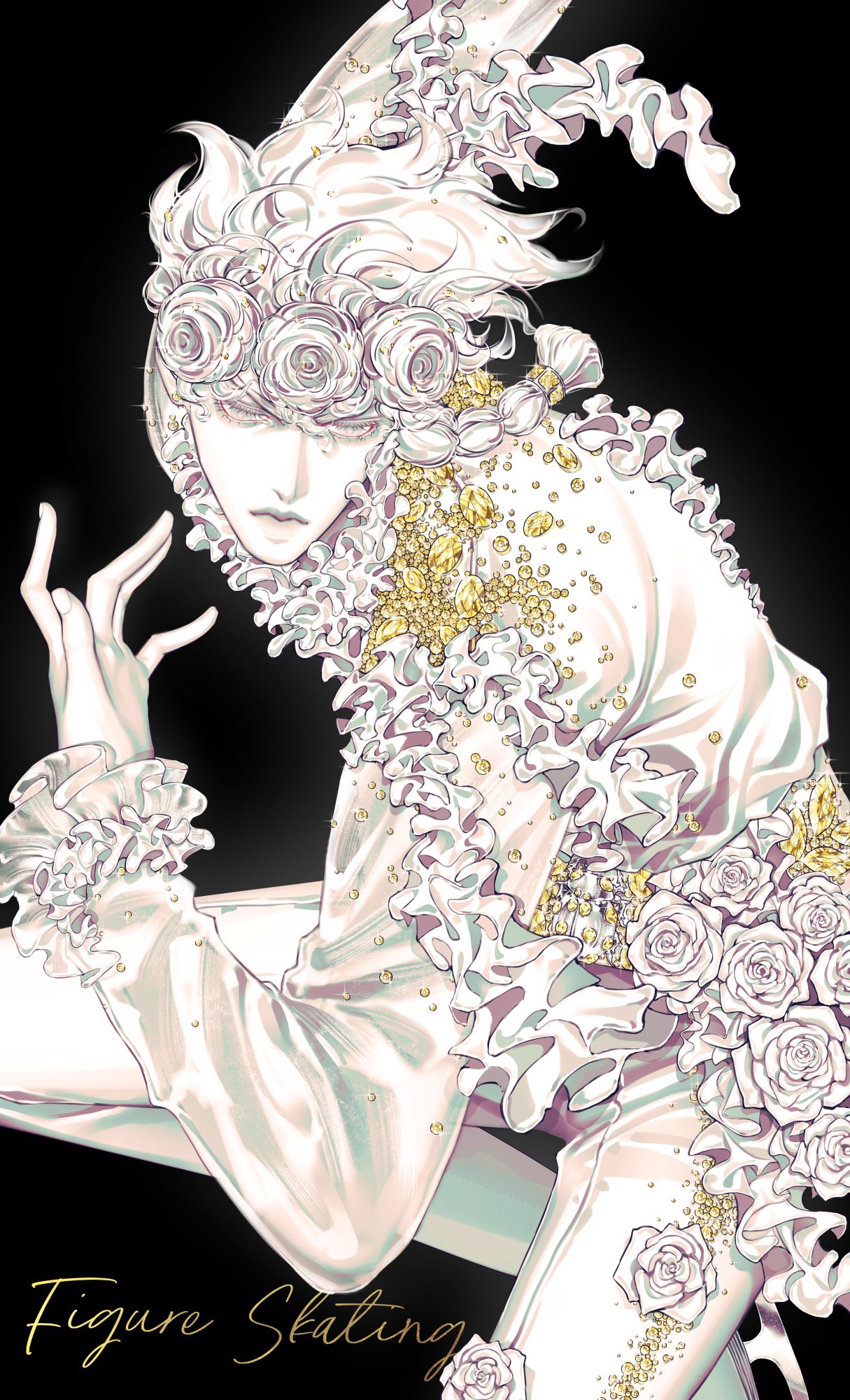 1boy alternate_costume bishounen black_background braid closed_mouth colored_skin english_text flower frilled_shirt frilled_sleeves frills gem giorno_giovanna grey_eyes hand_up hashtag-only_commentary highres jojo_no_kimyou_na_bouken long_sleeves looking_at_viewer male_focus pants rose shirt single_braid solo vento_aureo victory_rolls white_flower white_hair white_pants white_rose white_shirt white_skin white_theme yellow_gem zhhy3324