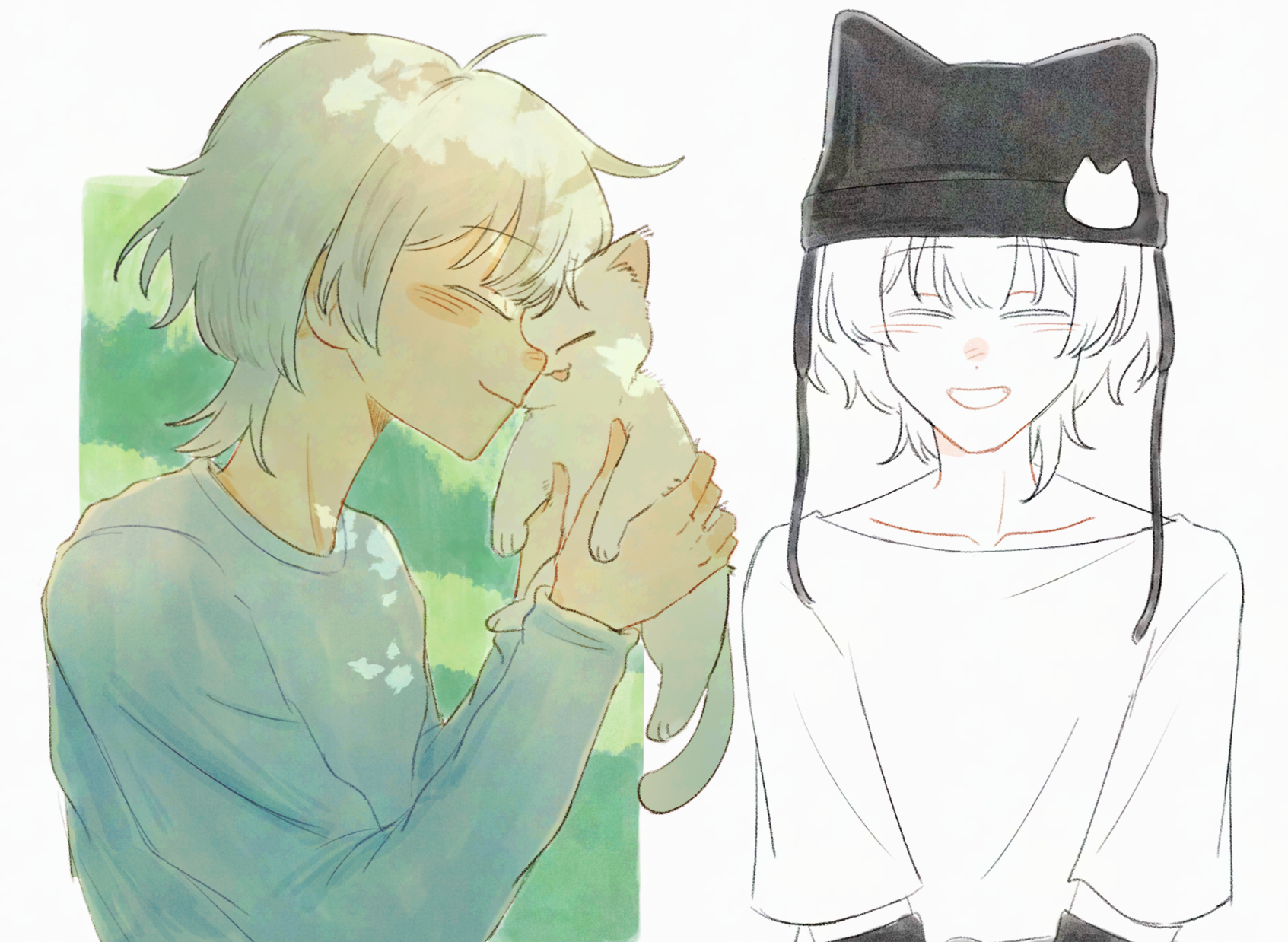 1girl animal_ear_headwear animal_ears bang_dream! bang_dream!_it's_mygo!!!!! blush cat cat_ears closed_eyes closed_mouth commentary fake_animal_ears gampong44 highres kaname_raana long_sleeves multiple_views raana_the_cat shirt short_hair short_sleeves smile untranslatable_commentary white_hair white_shirt