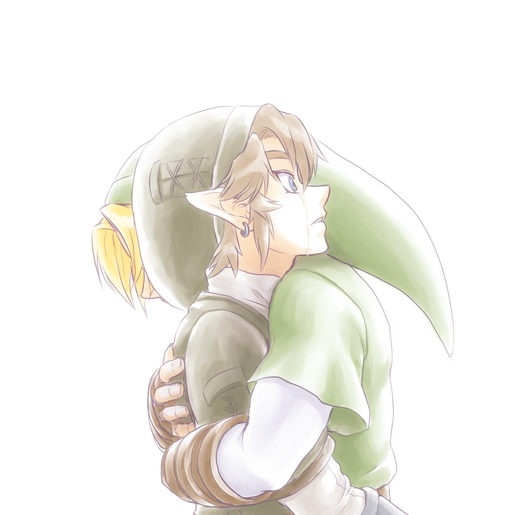 2boys ancestor_and_descendant blonde_hair blue_eyes brown_gloves chikuwa_(rinka) cropped_torso crying crying_with_eyes_open curtained_hair fingerless_gloves gloves green_hat green_tunic hat hug link long_sleeves male_focus multiple_boys nintendo pointy_ears short_hair simple_background tears the_legend_of_zelda the_legend_of_zelda:_ocarina_of_time the_legend_of_zelda:_twilight_princess tunic upper_body white_background white_sleeves