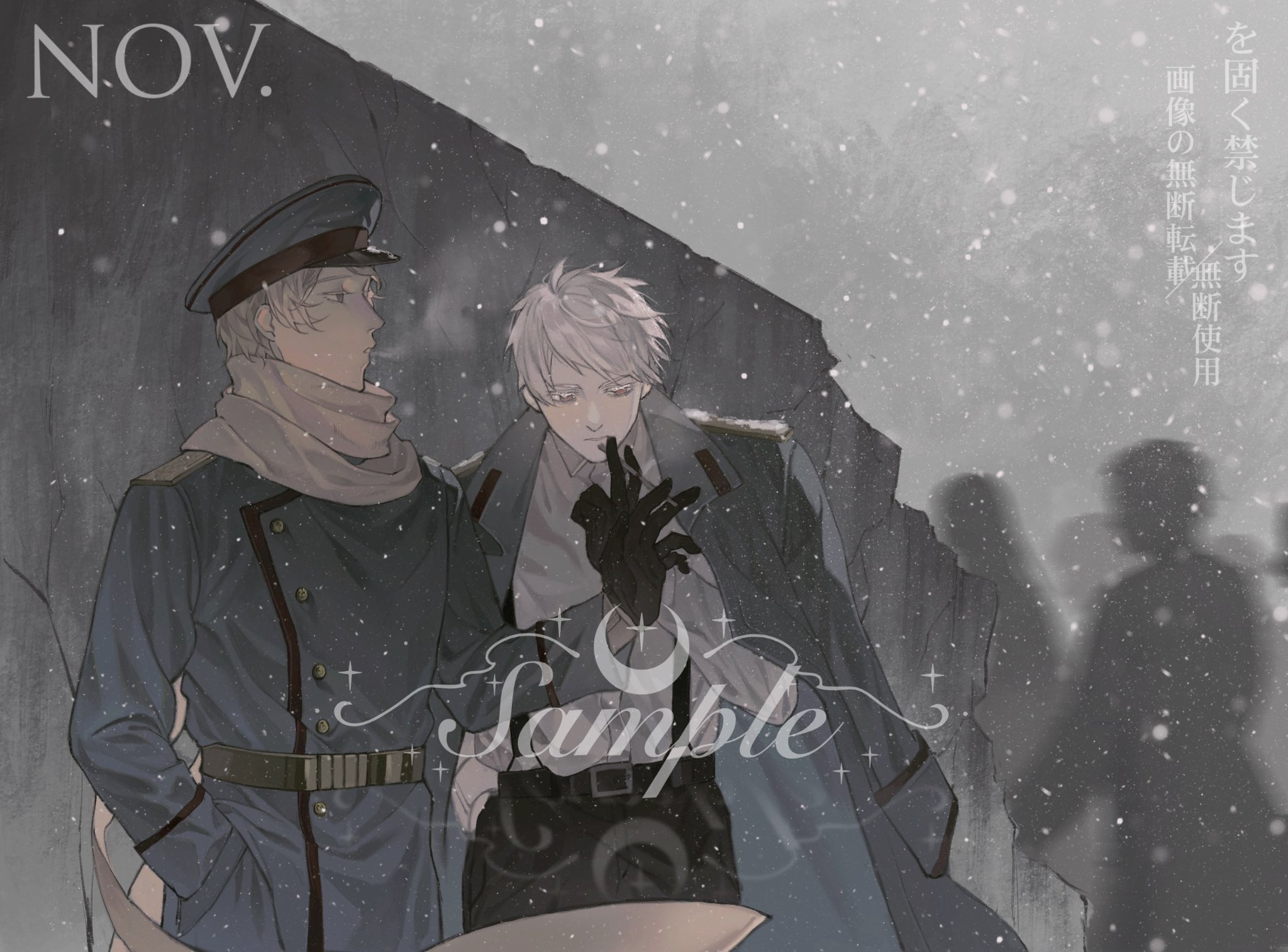 2boys 5others axis_powers_hetalia belt between_fingers black_gloves black_pants buttons cigarette closed_mouth coat collared_shirt cowboy_shot day gloves gold_belt grey_coat grey_hair grey_hat grey_jacket grey_sky half-closed_eyes hand_in_pocket hand_up hands_up hat highres holding holding_cigarette jacket lapels long_sleeves looking_down male_focus military_hat military_jacket military_uniform multiple_boys multiple_others open_clothes open_coat open_mouth outdoors pants prussia_(hetalia) purple_eyes rj91026205 russia_(hetalia) sample_watermark scarf shirt short_hair silhouette sky smoke smoking snowing sparkle standing suspenders walking watermark white_hair white_scarf white_shirt winter