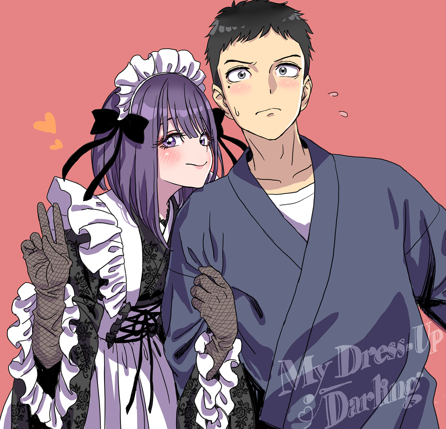 1boy 1girl apron arm_hug black_hair black_kimono blush cosplay fishnet_gloves fishnets gloves gojou_wakana highres japanese_clothes kimono kitagawa_marin kuroe_shizuku kuroe_shizuku_(cosplay) maid maid_headdress medium_hair purple_eyes purple_hair red_background short_hair simple_background sono_bisque_doll_wa_koi_wo_suru v white_apron yamashita_shun'ya