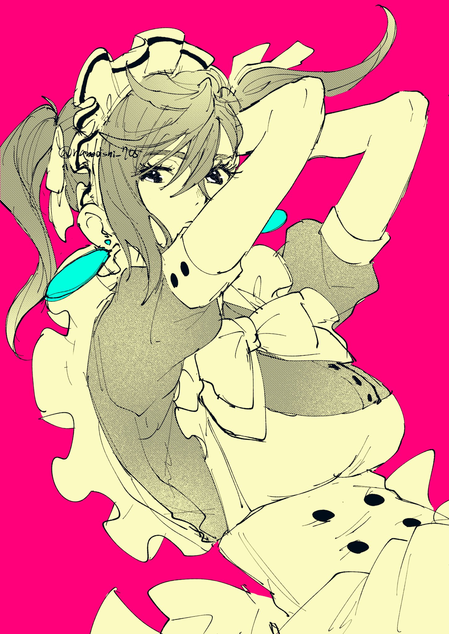 1girl apron arms_behind_head ayase_momo bow breasts crossed_bangs dandadan earrings frilled_apron frills hair_between_eyes hair_ribbon highres jewelry looking_at_viewer maid maid_apron maid_headdress medium_breasts medium_hair nabeoishi_705 official_alternate_costume pink_background puffy_short_sleeves puffy_sleeves ribbon short_sleeves solo twintails twitter_username upper_body white_apron white_bow