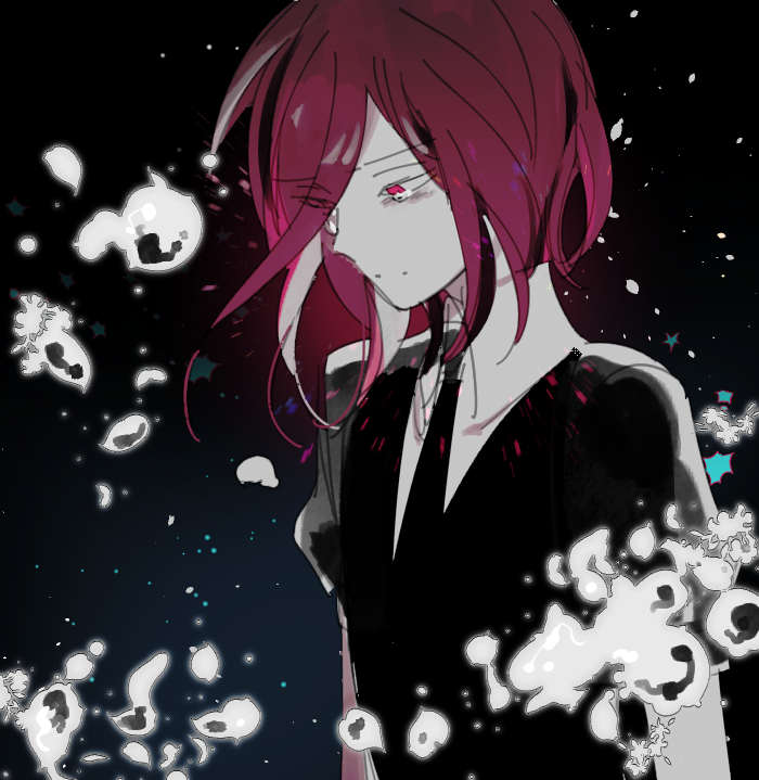 1other black_necktie cinnabar_(houseki_no_kuni) closed_mouth commentary_request gem_uniform_(houseki_no_kuni) houseki_no_kuni looking_down medium_hair necktie red_eyes red_hair tears upper_body yoursincere