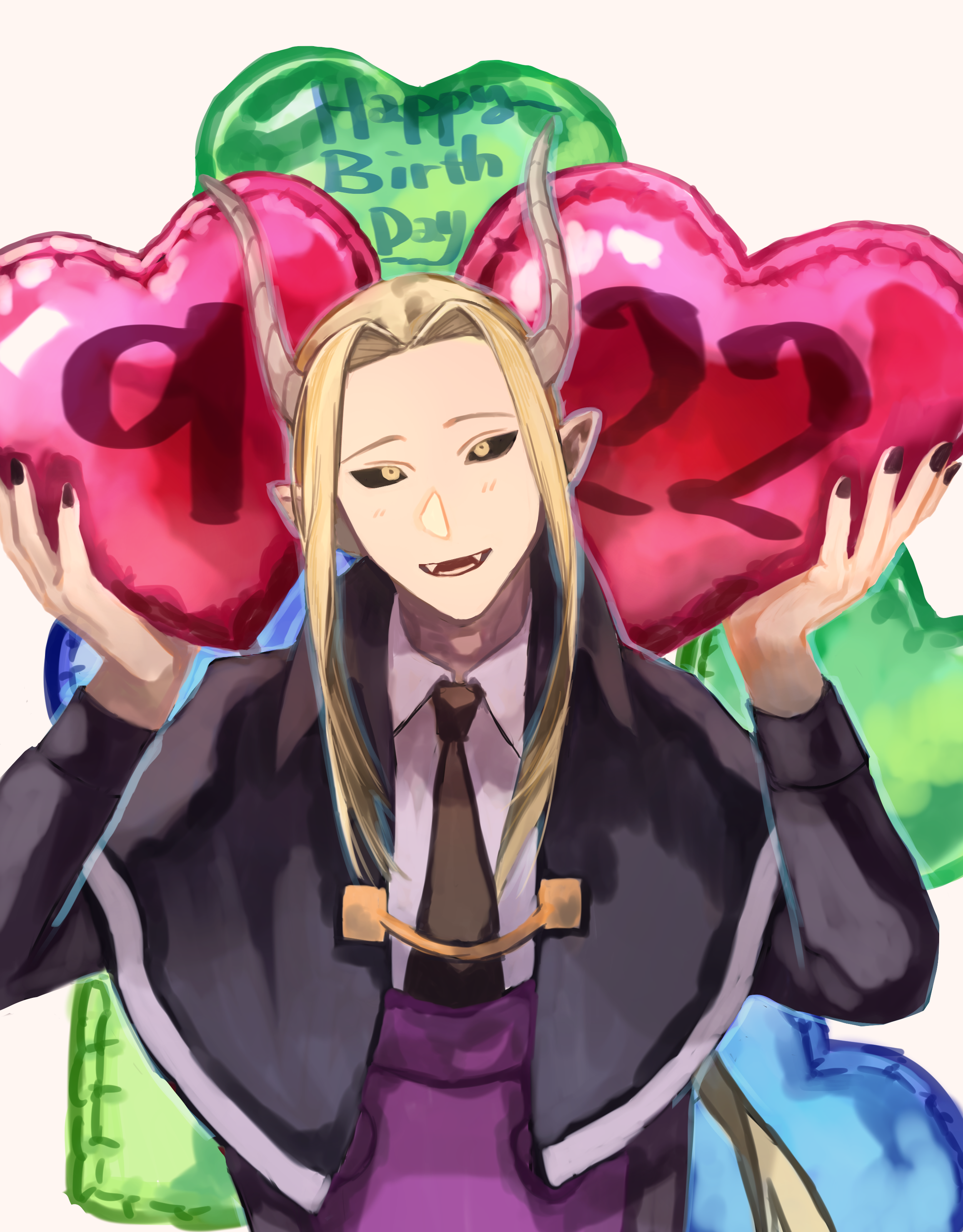 :d absurdres balloon black_nails black_necktie black_sclera blonde_hair capelet colored_sclera dated fangs happy_birthday heart_balloon highres horns ipos_ichou long_sleeves mairimashita!_iruma-kun necktie open_mouth pointy_ears smile upper_body yellow_eyes yukisk