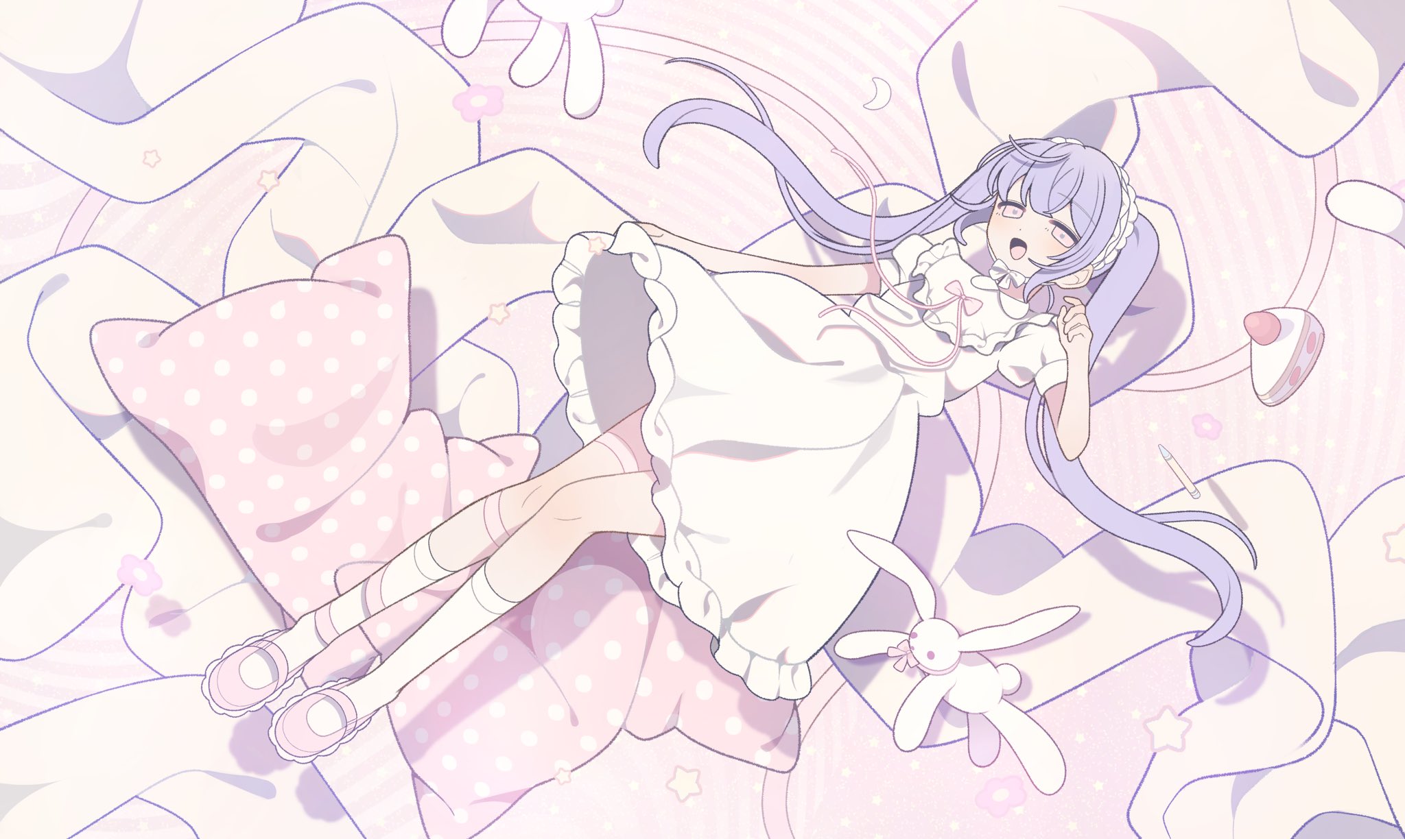 1girl :d bonnet bow bowtie cake cake_slice dress flower food frilled_bonnet frilled_dress frills from_above fruit full_body hair_between_eyes hand_up highres kneehighs kotoruri long_legs lying mary_janes medium_dress on_back open_mouth original pencil pillow pink_background pink_bow pink_bowtie pink_eyes pink_flower pink_shoes puffy_short_sleeves puffy_sleeves purple_hair shadow shoes short_sleeves simple_background smile socks solo star_(symbol) strawberry strawberry_cake stuffed_animal stuffed_rabbit stuffed_toy thigh_strap tongue twintails white_bonnet white_bow white_dress white_socks