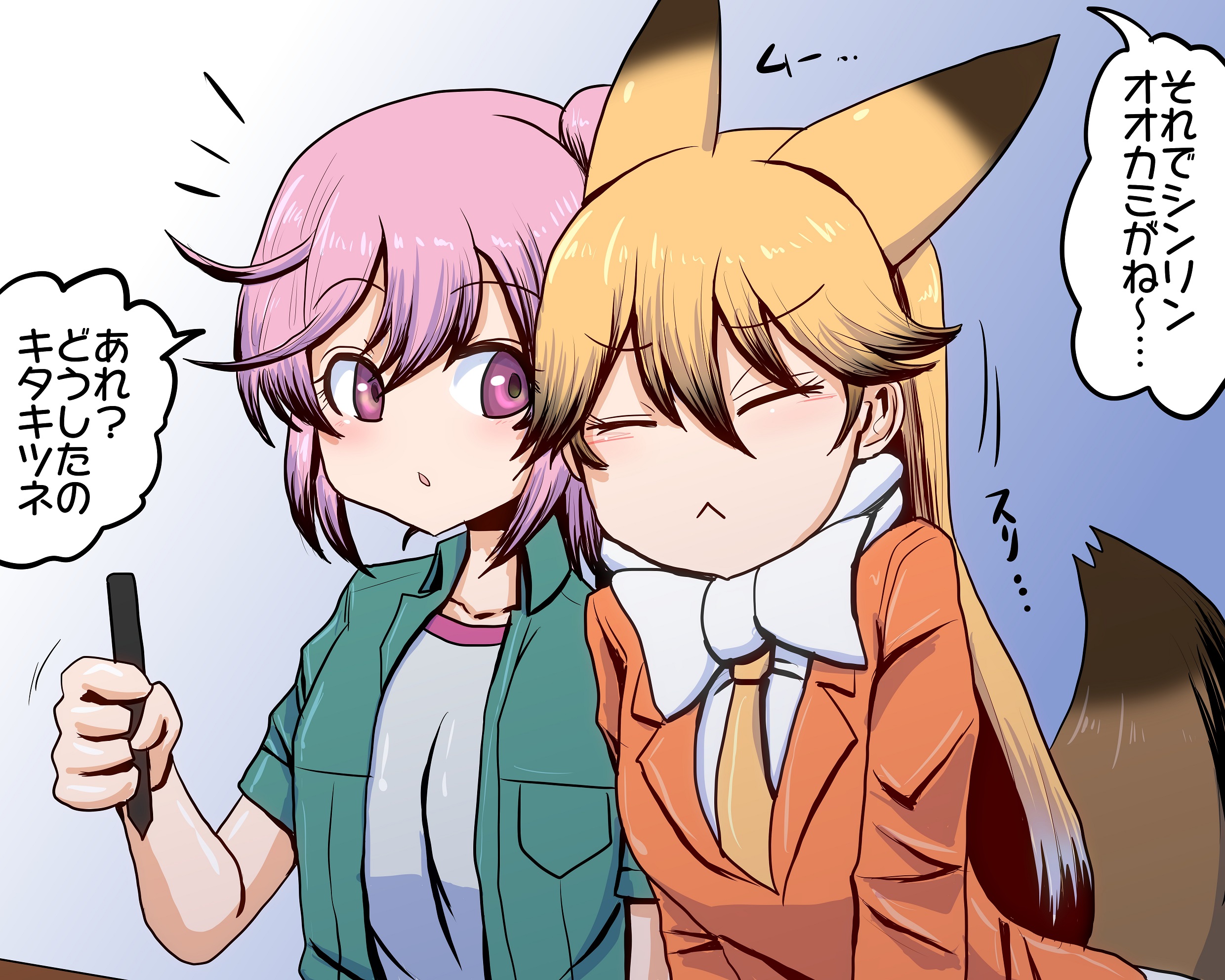 2girls :< animal_ears bow bowtie brown_hair closed_eyes extra_ears ezo_red_fox_(kemono_friends) fox_ears fox_girl fox_tail green_jacket hair_between_eyes highres jacket kemono_friends long_sleeves multicolored_hair multiple_girls nana_(kemono_friends) necktie open_clothes open_jacket orange_hair orange_jacket orange_necktie pencil pink_eyes pink_hair shinkaisoku shirt short_hair short_sleeves shoulder-to-shoulder side_ponytail sidelocks tail translation_request white_bow white_bowtie white_shirt