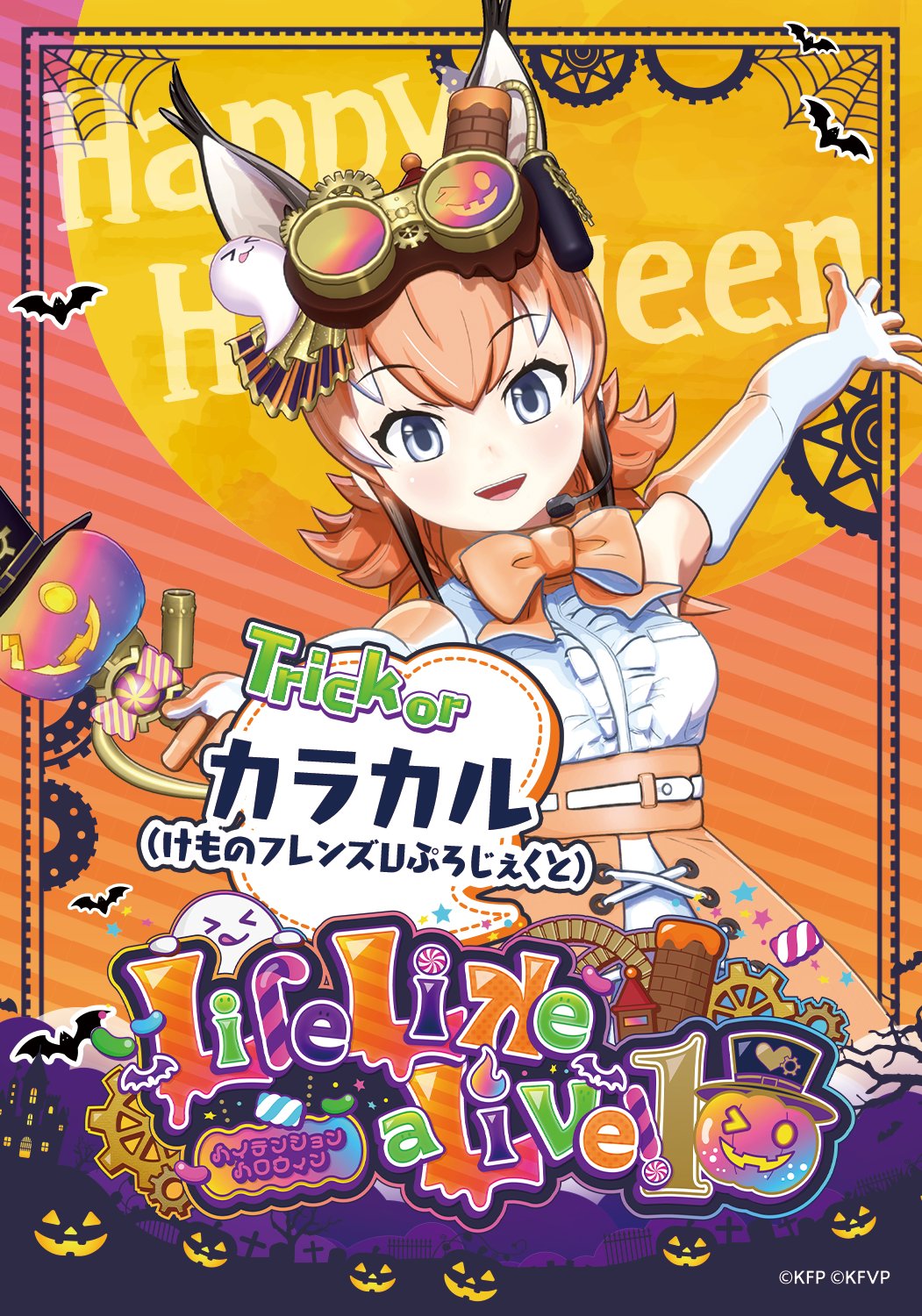1girl animal_ears bat_(animal) belt blue_eyes bow bowtie caracal_(kemono_friends) cat_ears cat_girl copyright_name elbow_gloves extra_ears gloves goggles halloween halloween_costume happy_halloween highres kemono_friends kemono_friends_v_project lifelikealive long_hair looking_at_viewer microphone official_art orange_hair pumpkin shirt skirt sleeveless sleeveless_shirt solo virtual_youtuber wand