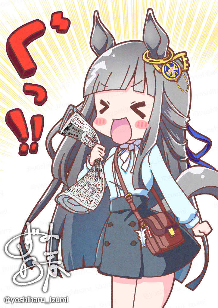 >_< 1girl animal_ears bag blunt_bangs blush blush_stickers breasts casual chrono_genesis_(casual)_(umamusume) chrono_genesis_(umamusume) clenched_hands closed_mouth commentary_request grey_hair hair_between_eyes hair_ornament holding holding_newspaper horse_ears horse_girl horse_tail newspaper satchel simple_background solo tail umamusume yoshiharu_izumi