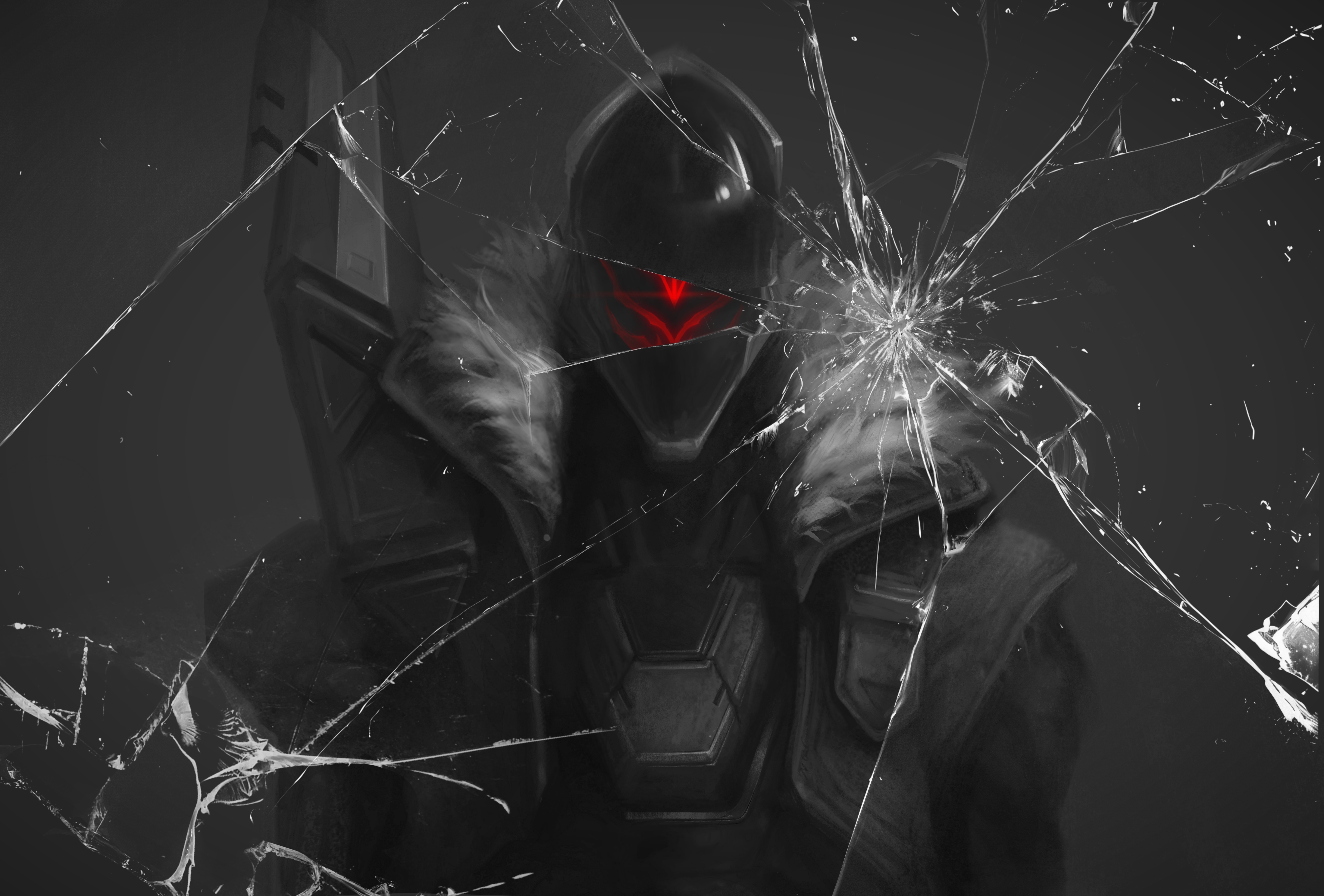 1boy absurdres broken_glass commentary fur_trim glass greyscale highres jhin league_of_legends lyinglynx male_focus mask monochrome project:_jhin solo spot_color untranslatable_commentary upper_body