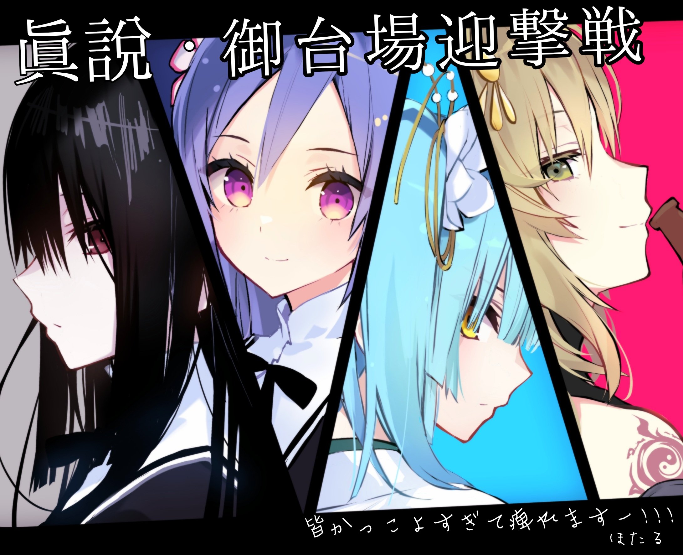 4girls akashi_manaka aoki_kaho artist_name assault_lily bare_shoulders black_hair black_ribbon black_shirt blue_background blue_hair blunt_bangs bottle brown_hair closed_mouth commentary_request copyright_name detached_sleeves flower green_eyes grey_background hair_between_eyes hair_flower hair_ornament highres hotaru_(ultraroly_poly) kannagi_(assault_lily) letterboxed light_smile long_hair looking_at_viewer looking_to_the_side multiple_girls neck_ribbon portrait profile purple_eyes purple_hair red_background red_eyes ribbon school_uniform shirayuki_(assault_lily) shirt shoulder_tattoo sideways_glance simple_background sleeveless sleeveless_shirt tattoo translation_request white_flower white_shirt yellow_eyes yin_yang yin_yang_tattoo yurigaoka_girls_academy_school_uniform