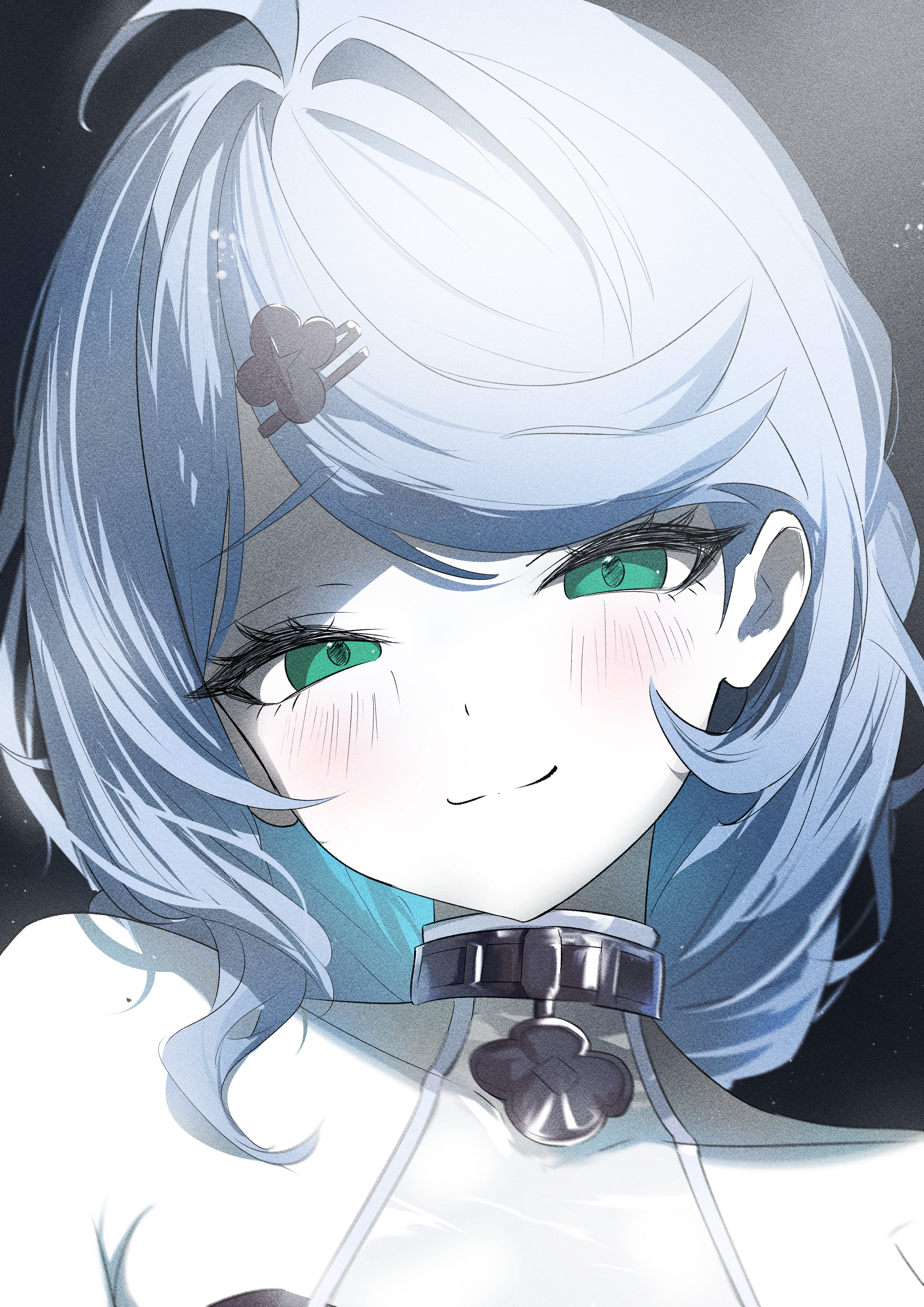 1girl absurdres armpit_crease bare_shoulders black_background blue_hair blush bubba62473394 closed_mouth collar flower_hairpin green_eyes hair_ornament hairpin head_tilt highres looking_at_viewer mole mole_on_shoulder ponytail portrait seed_(zenless_zone_zero) smile solo zenless_zone_zero