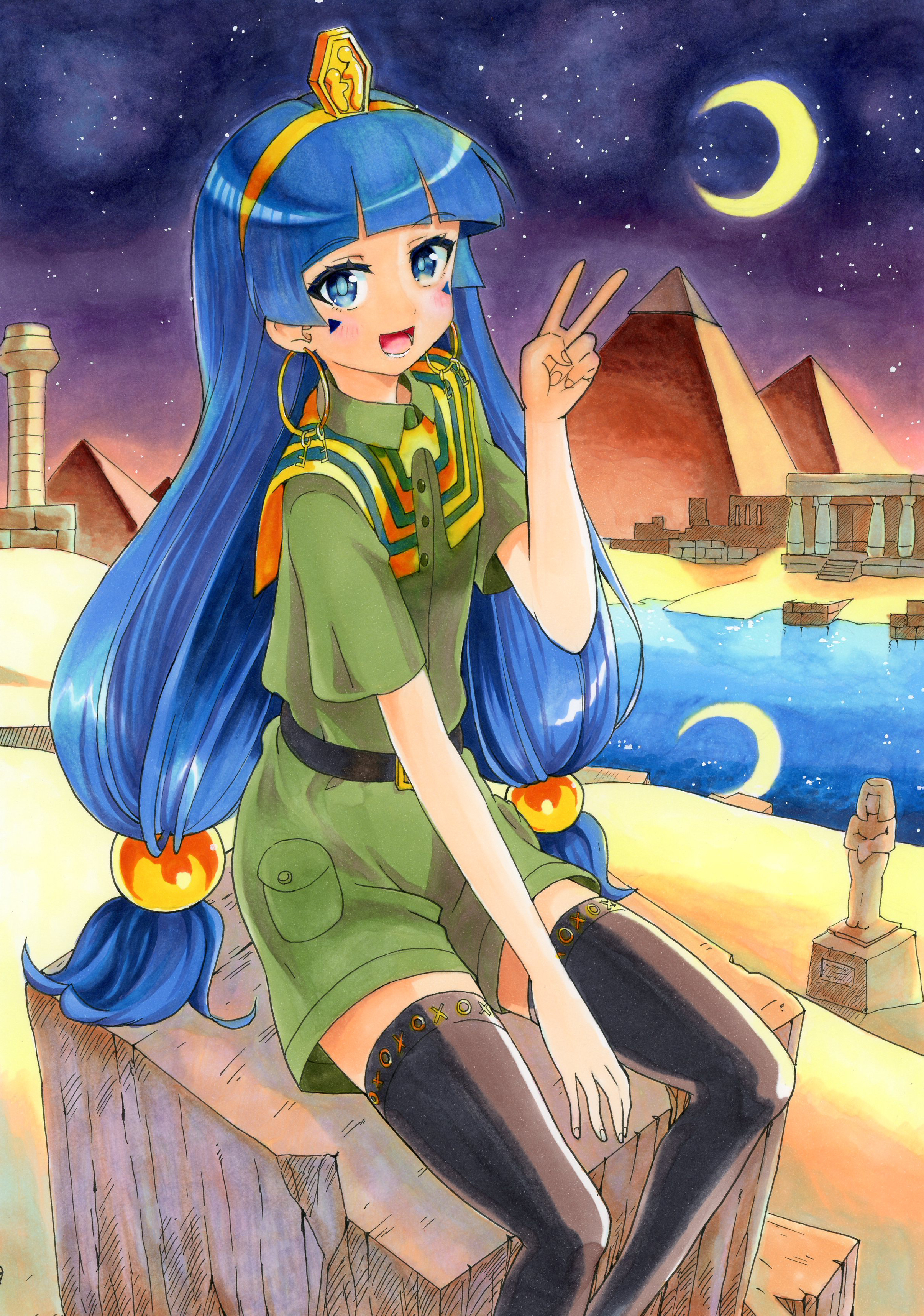 1girl absurdres belt belt_buckle black_belt black_thighhighs blue_eyes blue_hair brown_shirt brown_shorts buckle commentary_request crescent_moon desert earrings facial_mark gold gold_hairband hair_bobbles hair_ornament hairband highres hoop_earrings jewelry long_hair looking_at_viewer marker_(medium) michigami_nareko moon nenpuru night on_rock open_mouth outdoors pillar pyramid_(structure) reflection reflective_liquid river shirt short_sleeves shorts sitting sky solo star_(sky) starry_sky thighhighs touhou traditional_media triangle triangle_facial_mark usekh_collar v very_long_hair water