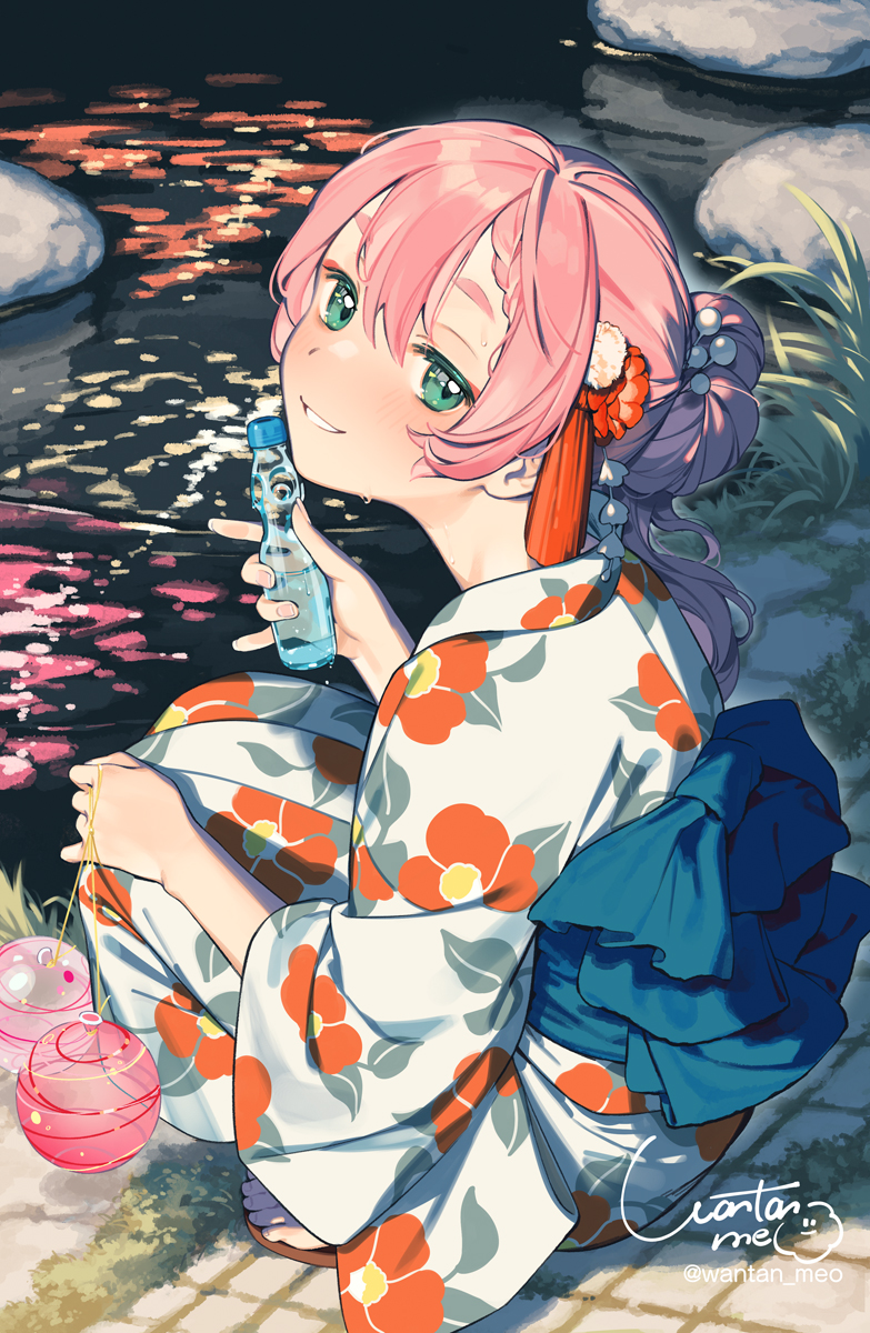 1girl blush commentary_request fireworks full_body green_eyes hair_bun hair_ornament highres japanese_clothes kanzashi kimono looking_at_viewer night original pink_hair reflection reflective_liquid smile solo squatting summer sweat tanabata tassel thick_eyebrows wantan_meo water yukata