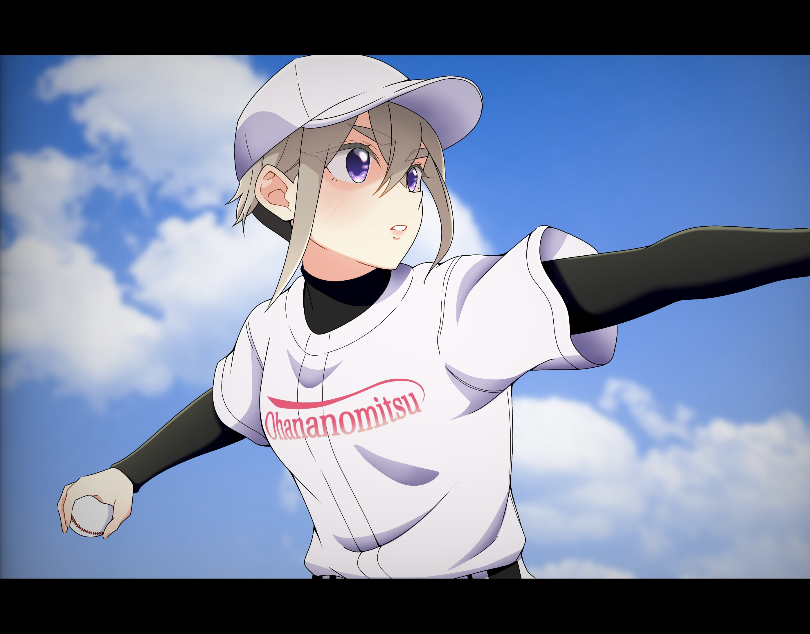 1girl ball baseball baseball_cap black_shirt blue_sky clothes_writing cloud commentary_request day eyelashes grey_hair hat highres holding holding_ball kimi_no_koto_ga_dai_dai_dai_dai_daisuki_na_100-nin_no_kanojo letterboxed long_sleeves pack0130 purple_eyes shirt short_hair short_sleeves sidelocks sky solo sutou_iku undercut undershirt upper_body variant_set very_short_hair white_hat white_shirt