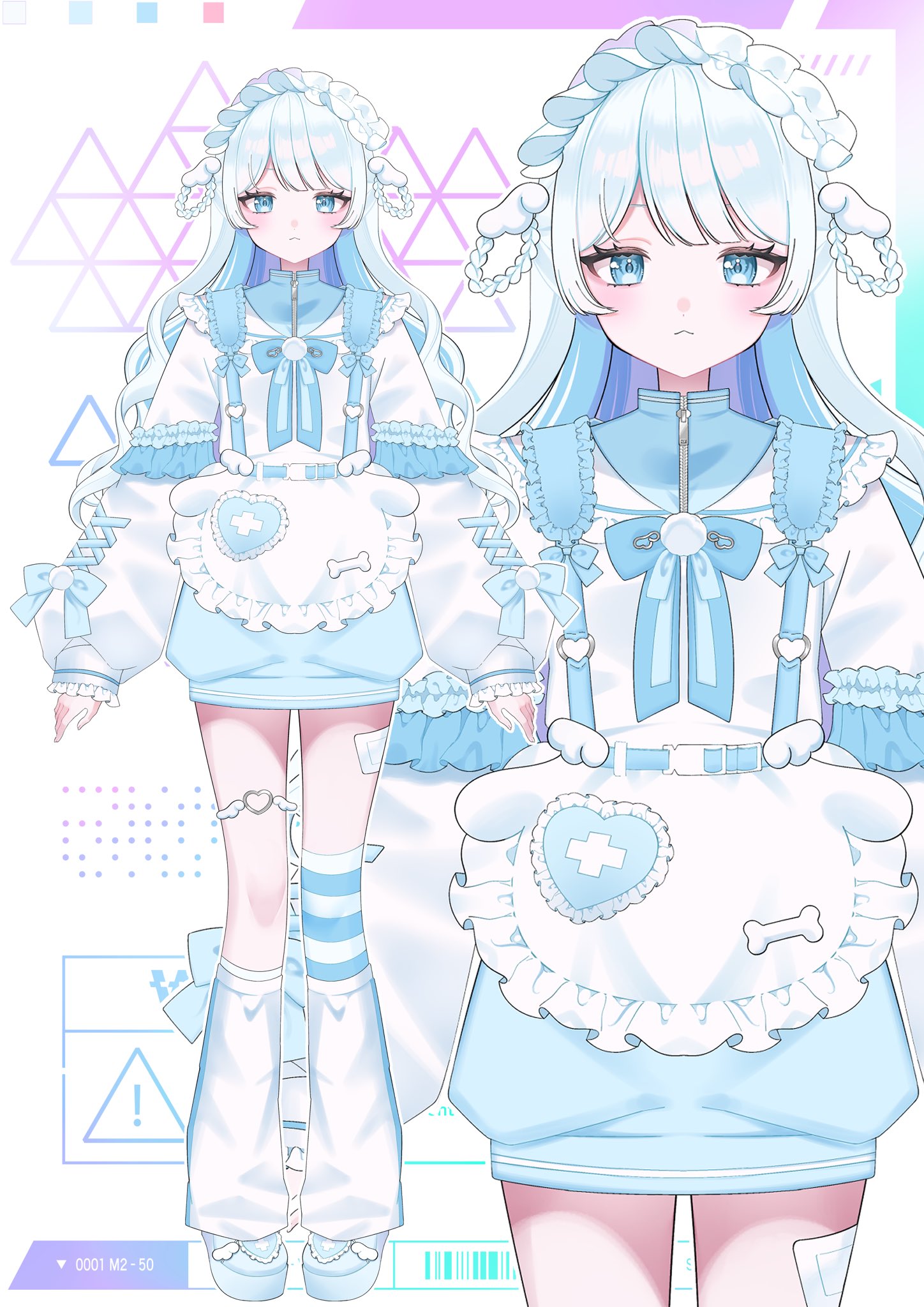 1girl angel_wings_hair_ornament apron bandage_on_leg blue_bow blue_eyes blue_hair blue_shorts bow braid braided_hair_rings closed_mouth commentary cowboy_shot english_commentary frilled_apron frilled_headwear frills full_body hair_between_eyes hair_rings half_updo highres jacket kneehighs leg_warmers lilichanxxx long_hair looking_at_viewer multicolored_hair multiple_views original shorts single_kneehigh single_sock sleeves_past_wrists socks straight-on striped_clothes striped_socks tenshi_kaiwai two-tone_hair white_hair white_leg_warmers