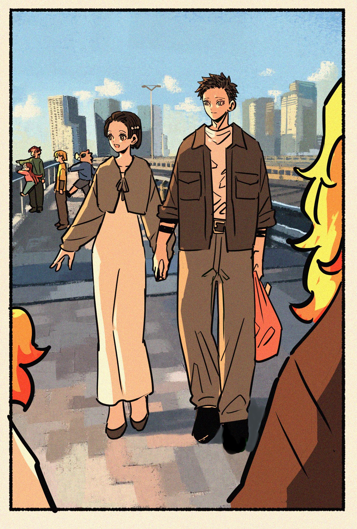 2girls 6+boys agatsuma_zenitsu black_hair black_jacket black_shoes black_shorts blonde_hair blue_pants blue_shirt boar_mask border brother_and_sister brown_hair building cardigan cityscape closed_mouth contemporary couple dress full_body green_shirt grey_cardigan grey_pants grey_shoes hakuji_(kimetsu_no_yaiba) hashibira_inosuke hetero highres holding holding_hands holding_sack jacket kamado_nezuko kamado_tanjirou kimetsu_no_yaiba koyuki_(kimetsu_no_yaiba) long_dress multicolored_hair multiple_boys multiple_girls open_mouth orange_hair pants parted_bangs pink_shirt pointing rengoku_kyoujurou rengoku_senjurou sack shirt shoes short_hair shorts siblings skyscraper smile takeuchi_ryousuke two-tone_hair white_border white_dress white_shirt yellow_shirt