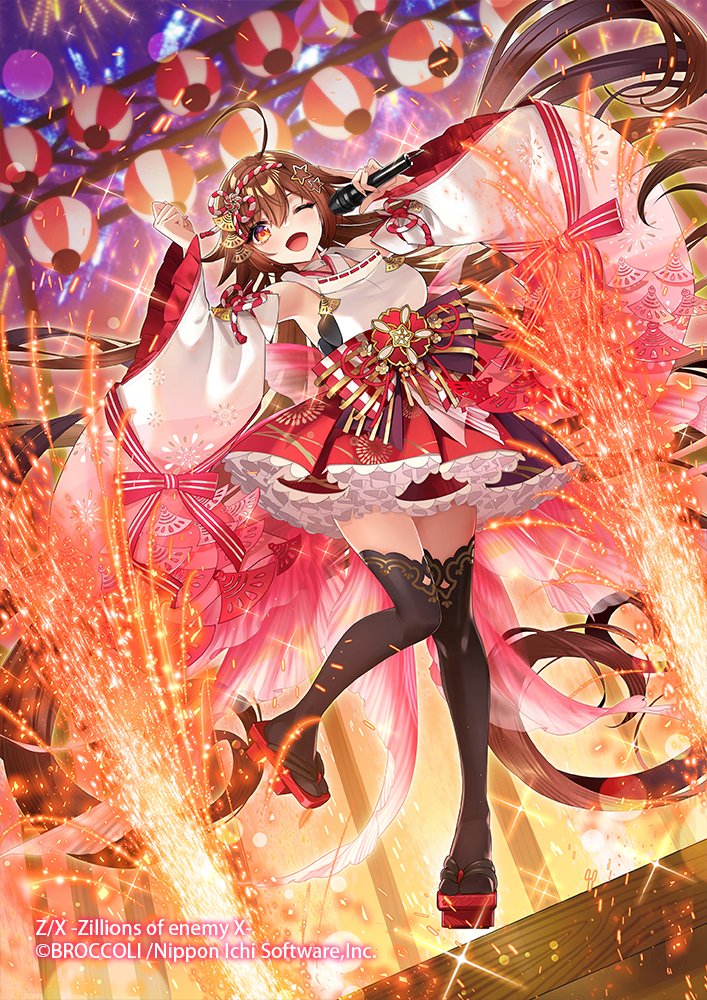 1girl ahoge armpits bare_shoulders black_thighhighs brown_eyes brown_hair concert copyright_notice detached_sleeves fireworks geta hair_ornament holding holding_microphone japanese_clothes kimono lantern long_hair microphone official_art one_eye_closed paper_lantern prism_(z/x) smile sparkle spinel_(9057) star_(symbol) star_hair_ornament thighhighs very_long_hair z/x