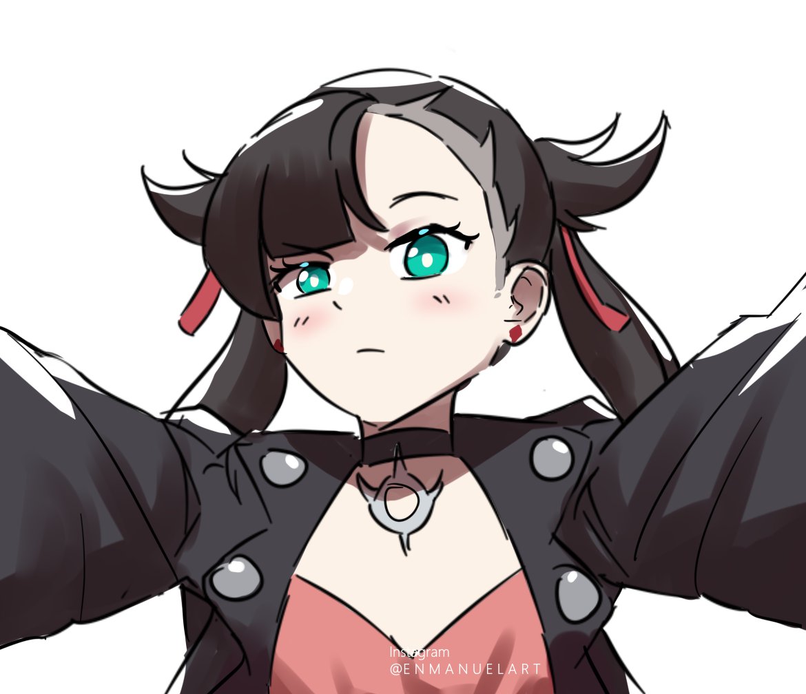 1girl aqua_eyes black_choker black_hair black_jacket bright_pupils choker closed_mouth commentary dress earrings english_commentary enma_(enmanuelart) hair_ribbon instagram_username jacket jewelry light_blush long_hair long_sleeves looking_at_viewer marnie_(pokemon) nintendo open_clothes open_jacket pink_dress pink_ribbon pokemon pokemon_sword_and_shield portrait pov ribbon simple_background solo stud_earrings twintails white_background white_pupils