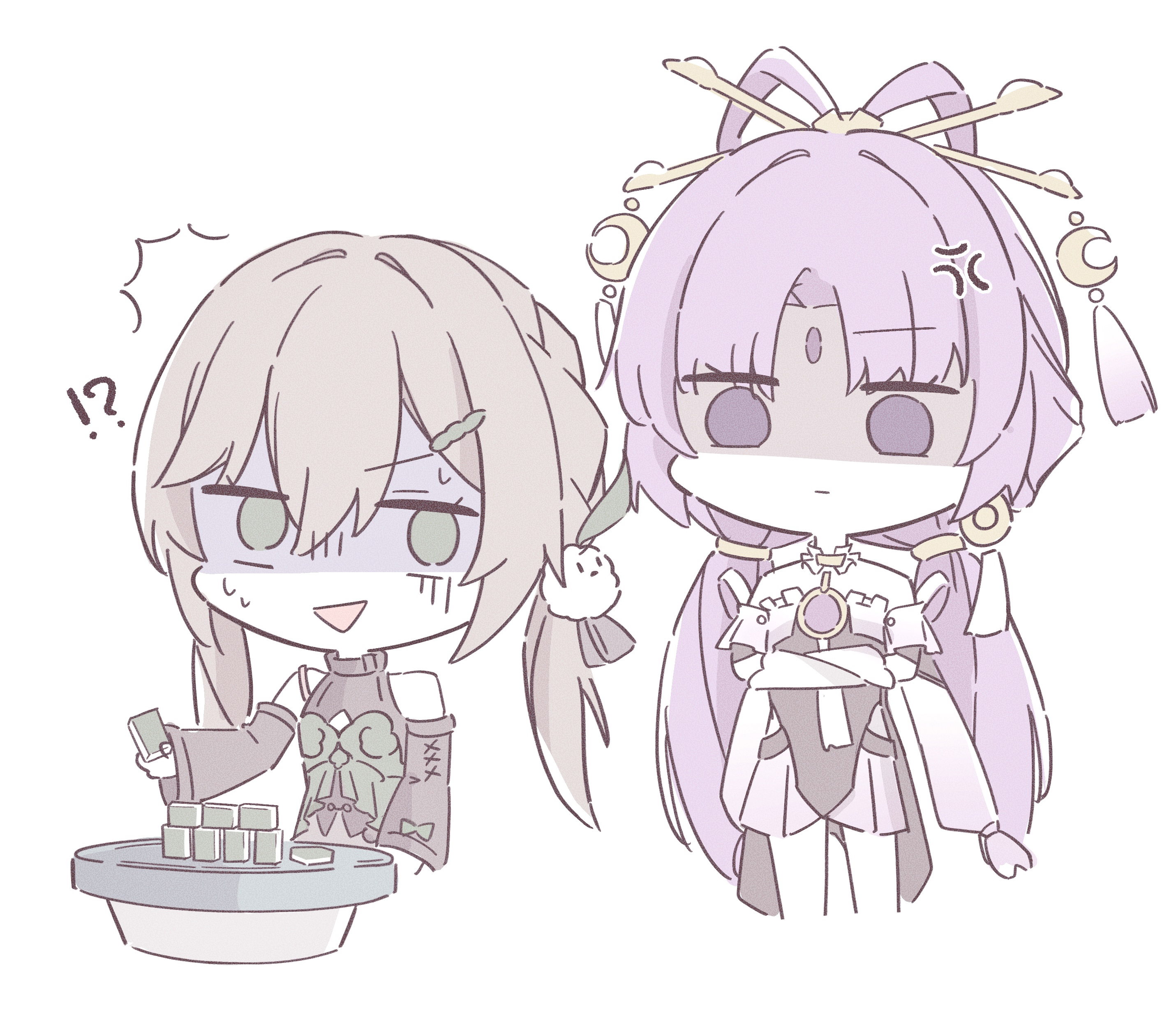 !? 2girls ^^^ absurdres anger_vein angry bare_shoulders black_dress black_ribbon black_sleeves braid brown_hair chinese_clothes closed_mouth cowboy_shot crescent crescent_ornament crossed_arms detached_sleeves dress earrings forehead_jewel frills fu_xuan_(honkai:_star_rail) gem green_eyes hair_ornament hair_ribbon hair_stick hairclip hand_up highres holding honkai:_star_rail honkai_(series) hoop_earrings jewelry long_hair long_sleeves looking_at_another low-tied_long_hair low_twintails multiple_girls nervous_smile no_pupils open_mouth parted_bangs pink_hair pom_pom_(clothes) pom_pom_hair_ornament purple_eyes purple_gem qingque_(honkai:_star_rail) r_no10126 ribbon shaded_face short_sleeves simple_background single_earring sitting sleeveless sleeveless_dress smile standing sweatdrop table tassel tassel_earrings turtleneck turtleneck_dress twintails two-tone_dress white_background white_dress white_sleeves wide_sleeves