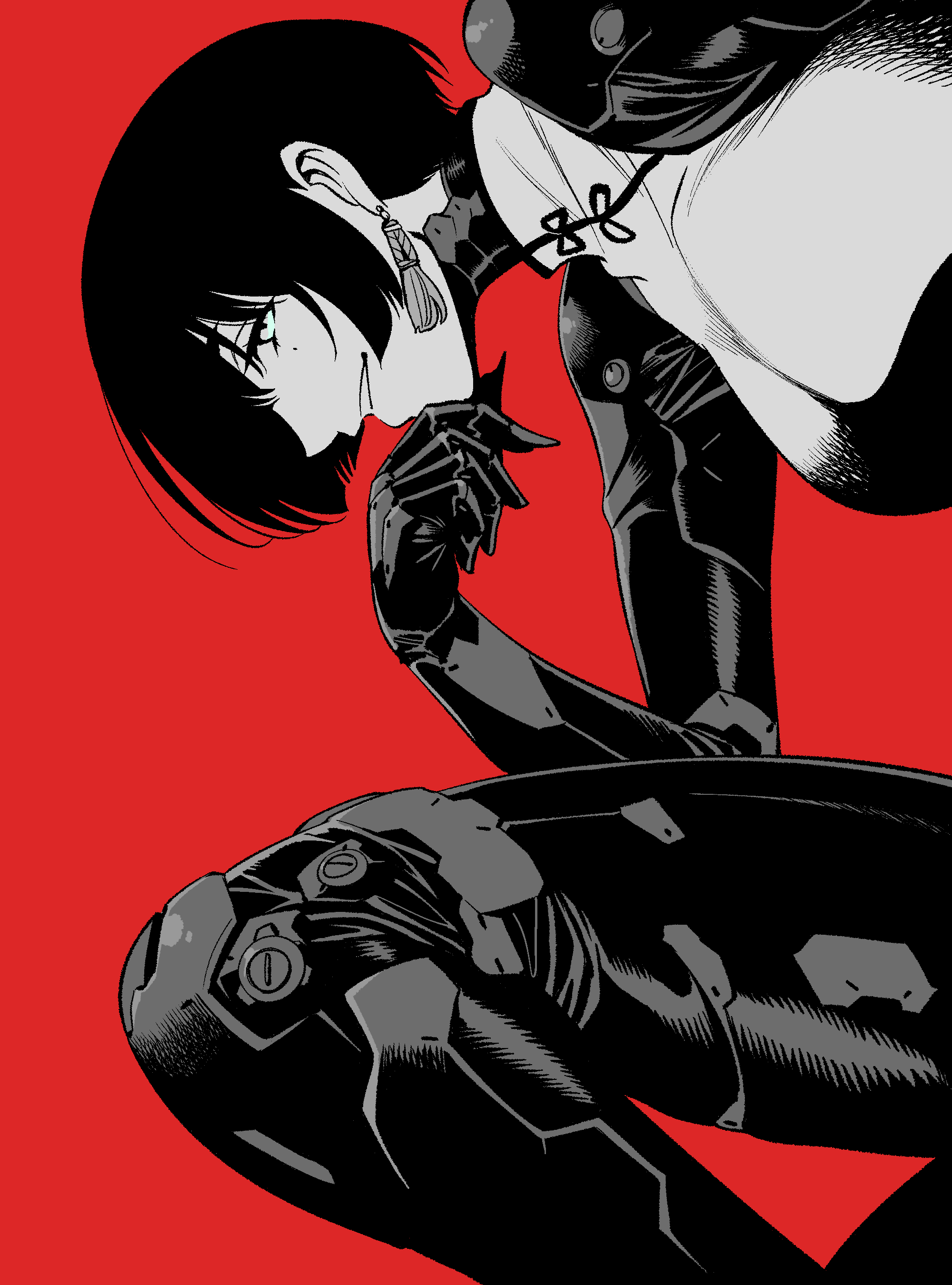 1girl absurdres arms_behind_back black_hair breasts china_dress chinese_clothes dress earrings halftone highres jewelry joints kato_takuji looking_at_viewer mechanical_arms mechanical_legs mole mole_under_eye monochrome original red_background robot_joints science_fiction short_hair simple_background sleeveless sleeveless_dress smile solo