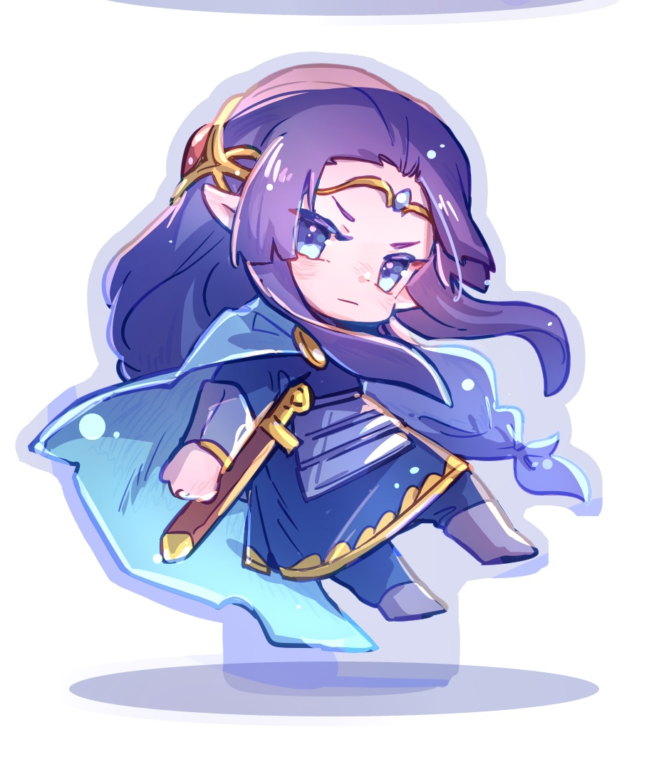 1boy aicori1 aqua_eyes cape chibi circlet closed_mouth elf fingolfin floating_hair full_body gem jewelry long_hair looking_at_viewer male_focus parted_bangs pointy_ears simple_background solo sword the_silmarillion tolkien's_legendarium weapon white_background