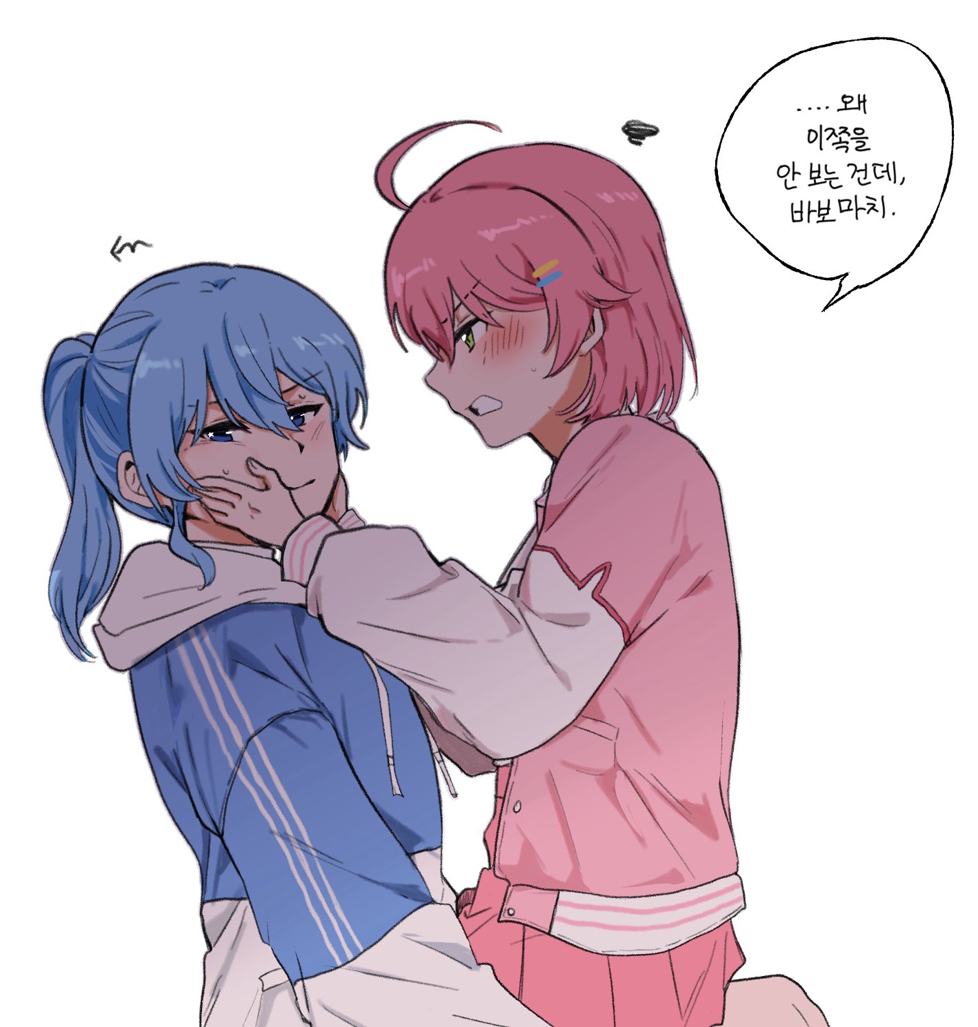 2girls blue_eyes blue_hair blue_hoodie blush clenched_teeth commentary green_eyes h_ero_d hand_on_another's_face highres hololive hood hoodie hoshimachi_suisei korean_text multiple_girls pink_hair pink_shirt pink_skirt pleated_skirt ponytail sakura_miko shirt short_hair skirt speech_bubble squiggle teeth translation_request virtual_youtuber yuri
