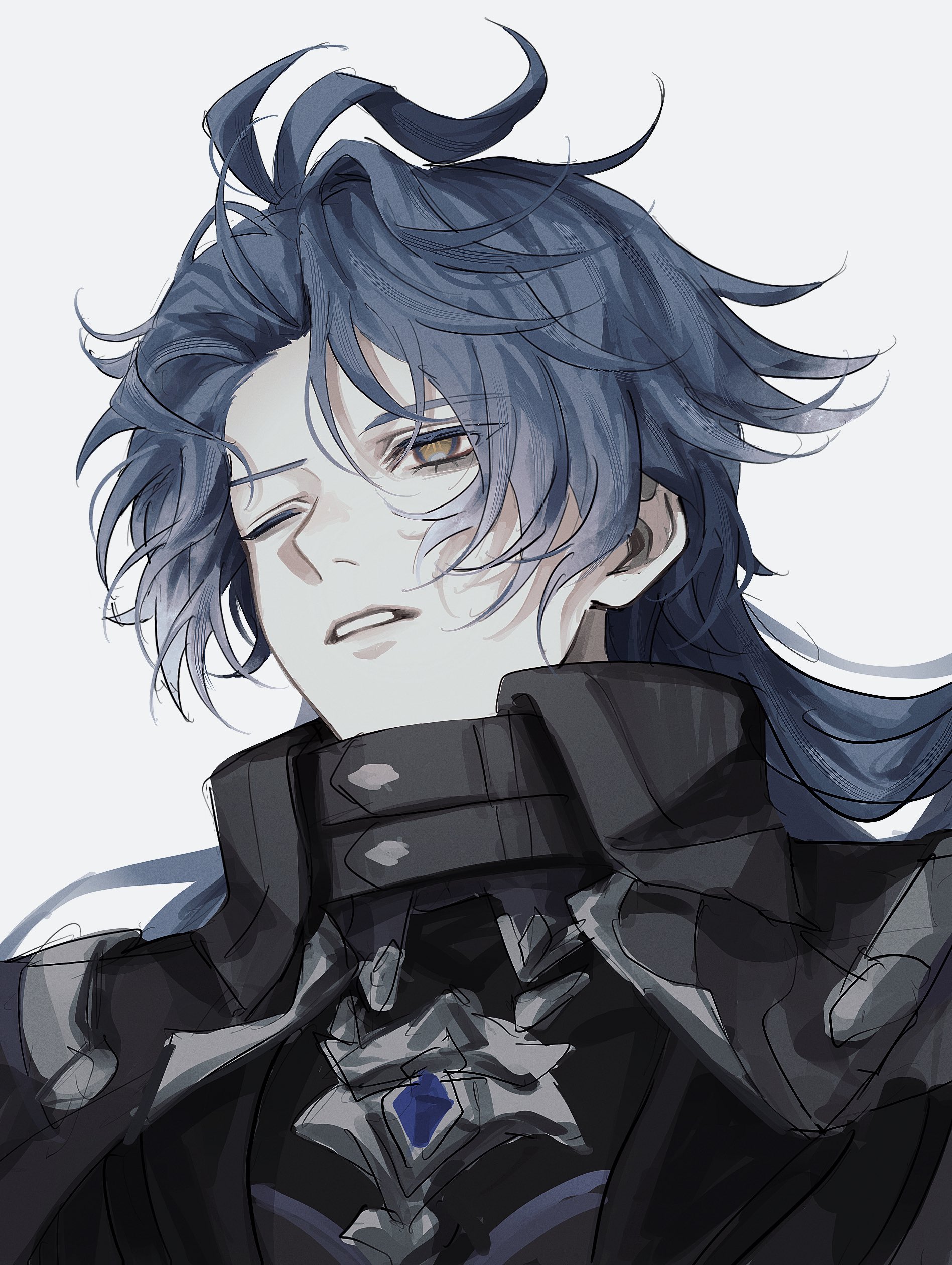 1boy absurdres antenna_hair commentary empty_eyes flins_(genshin_impact) fz7047 genshin_impact hair_behind_ear highres long_hair male_focus one_eye_closed parted_lips simple_background sketch solo teeth unfinished upper_body white_background yellow_eyes