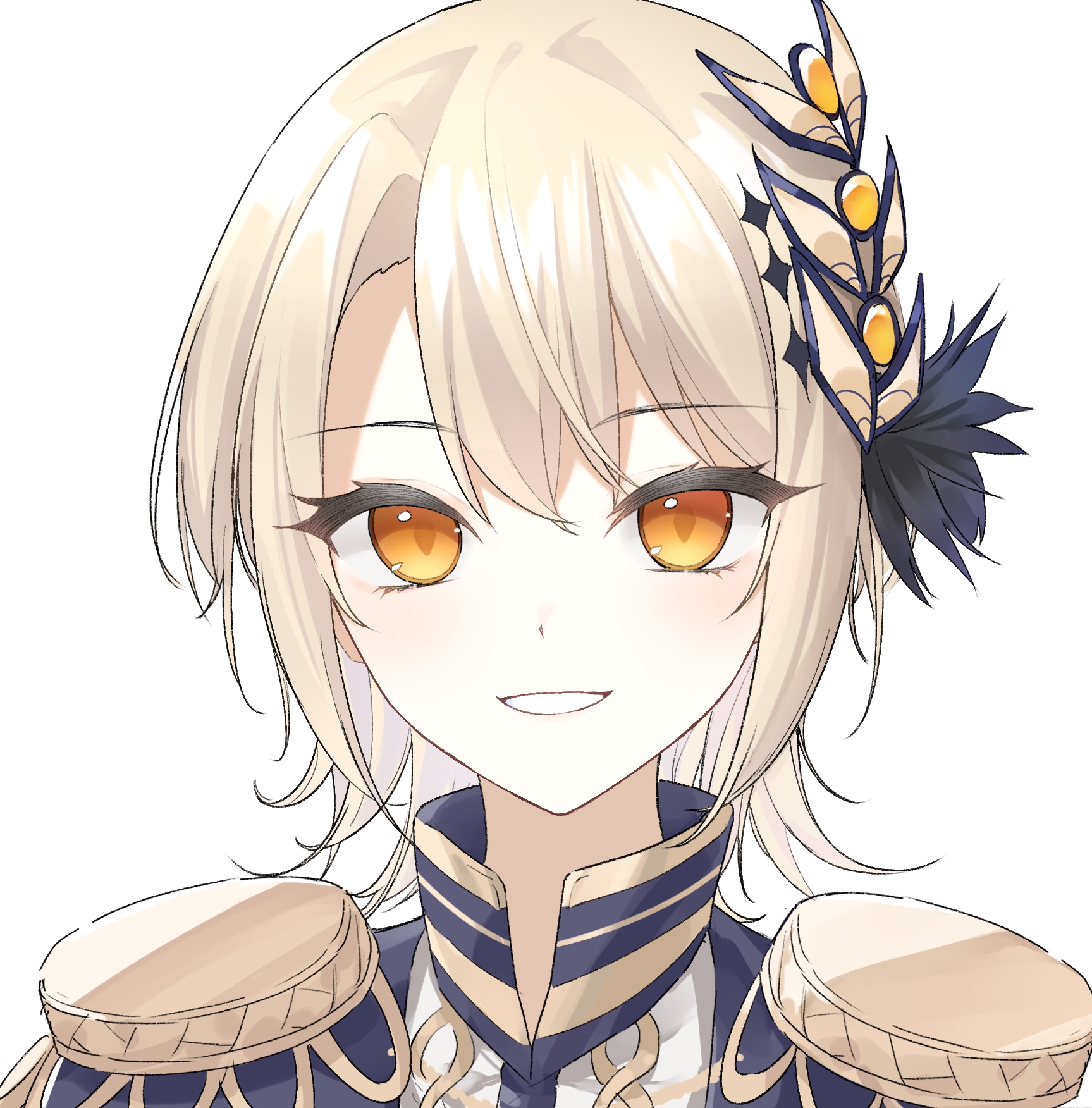 1girl black_jacket blonde_hair commentary_request epaulettes hair_between_eyes hair_ornament hasumi_leia highres ise_dango jacket looking_at_viewer magical_girl mahou_shoujo_no_majo_saiban short_hair simple_background smile solo upper_body white_background yellow_eyes