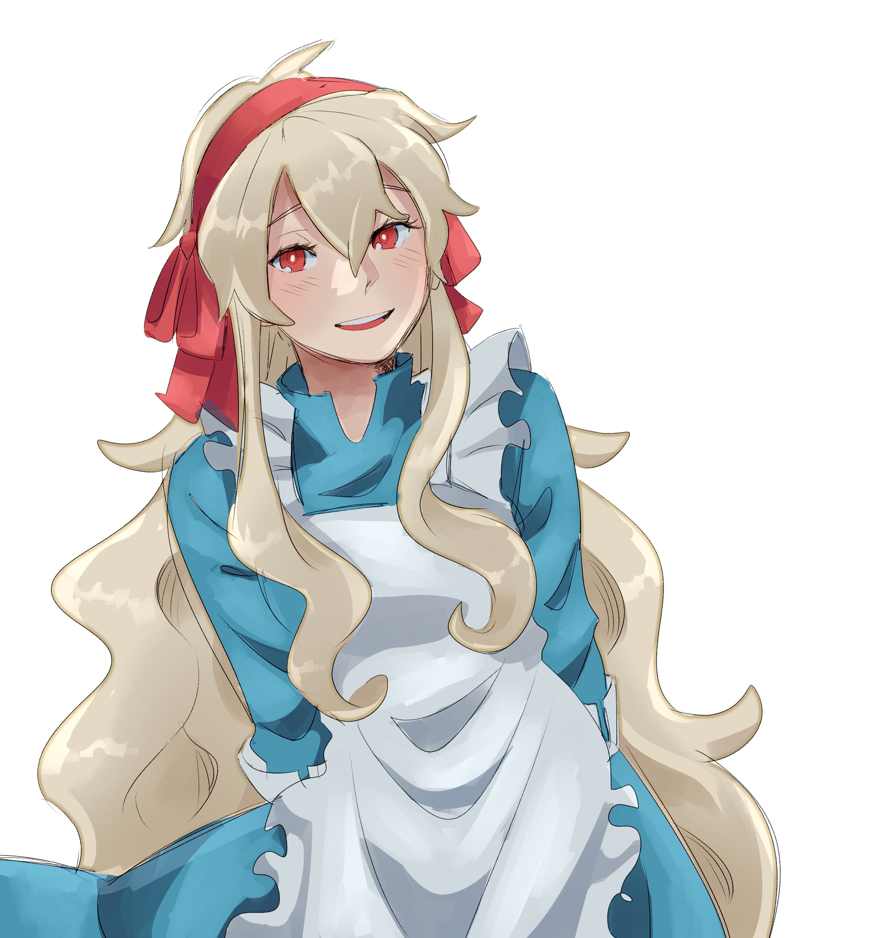 1girl absurdres apron arms_behind_back blonde_hair blue_dress commentary dress english_commentary hairband highres long_hair open_mouth original red_eyes red_hairband smile solo upper_body very_long_hair wavy_hair white_apron yooree