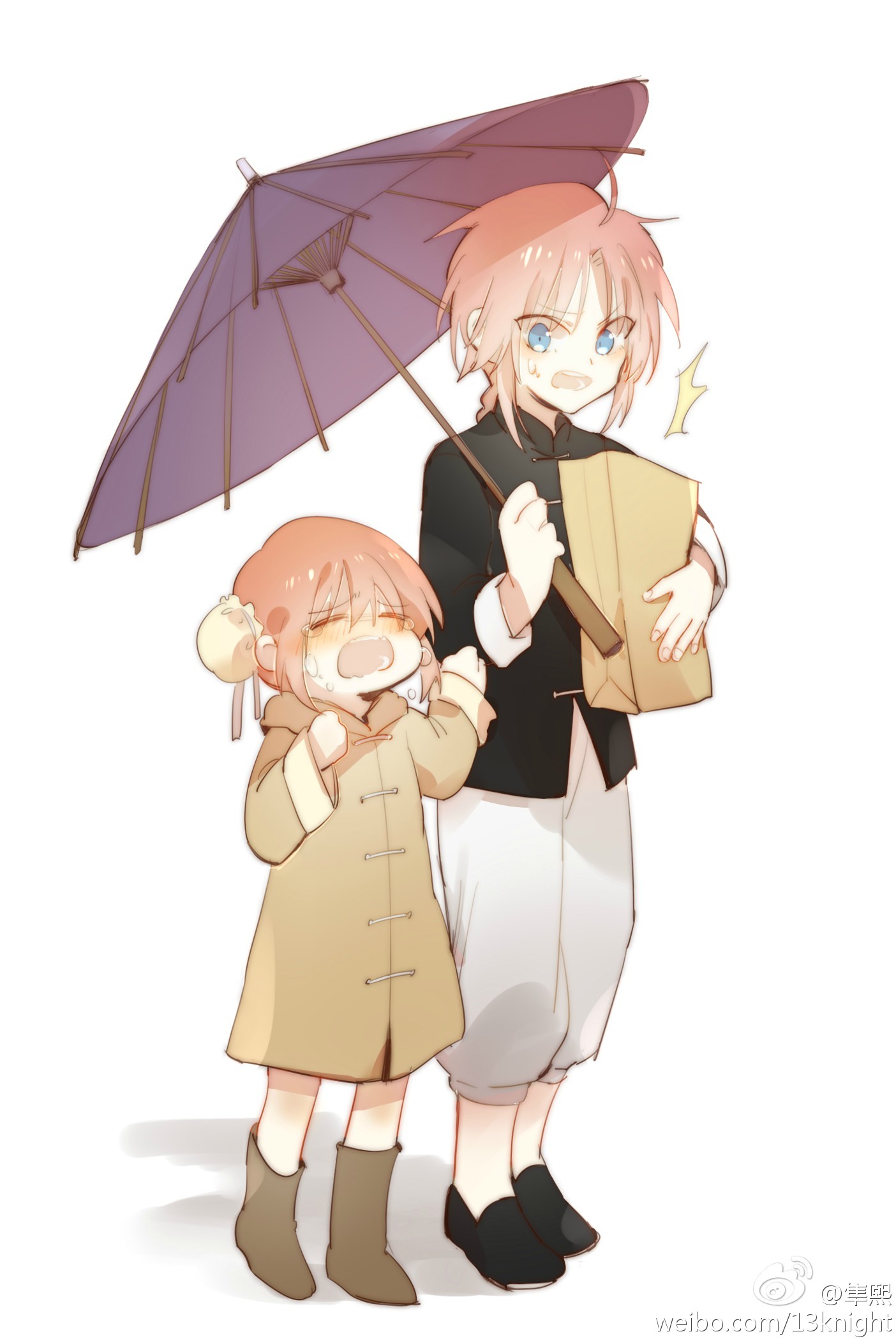 1boy 1girl ^^^ age_difference aged_down ahoge artist_name bag black_shirt black_shoes blue_eyes blush boots braid brother_and_sister brown_boots brown_coat bun_cover capri_pants child chinese_clothes chinese_commentary coat commentary_request crying flats flustered full_body furrowed_brow gintama hair_between_eyes hair_bun hands_up height_difference highres holding holding_umbrella hood hood_down hooded_coat kagura_(gintama) kamui_(gintama) long_sleeves looking_at_another looking_down looking_to_the_side nose_blush oil-paper_umbrella open_mouth orange_hair pants paper_bag parted_bangs puffy_pants pulling_another's_clothes purple_umbrella shirt shoes siblings simple_background single_braid single_hair_bun single_side_bun sleeve_cuffs standing sunxi sweatdrop tangzhuang tears umbrella watermark web_address weibo_watermark white_background white_pants wide-eyed