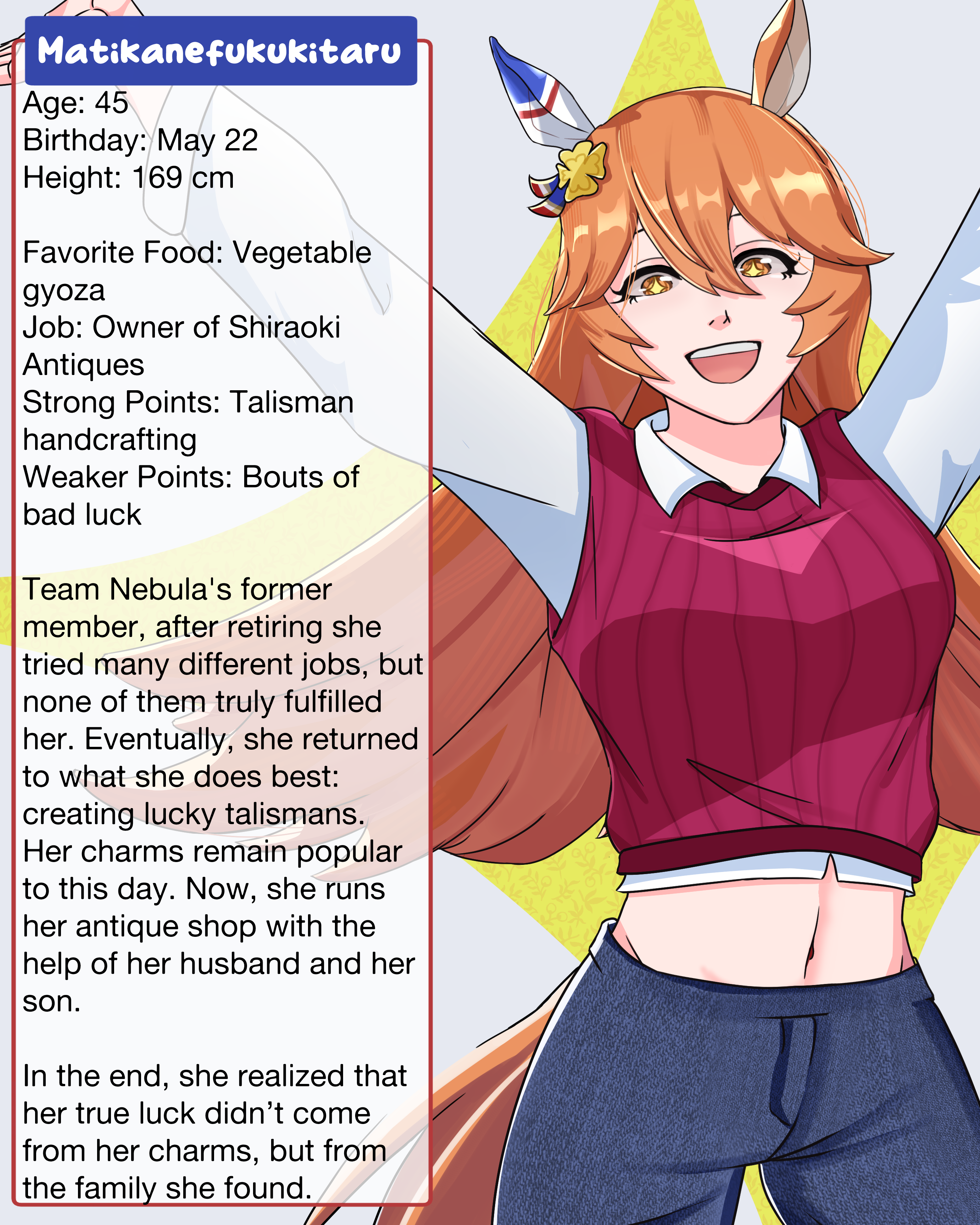 1girl :d absurdres aged_up alternate_costume alternate_universe animal_ears character_profile clover_hair_ornament commentary denim ear_covers english_commentary four-leaf_clover_hair_ornament hair_ornament hair_ribbon highres horse_ears horse_girl horse_tail jeans jewelry matikanefukukitaru_(umamusume) midriff_peek official_art_inset open_mouth orange_eyes orange_hair pants prefacegrim red_sweater_vest ribbon single_ear_cover smile star_(symbol) star_in_eye sweater_vest symbol_in_eye tail umamusume white_sleeves