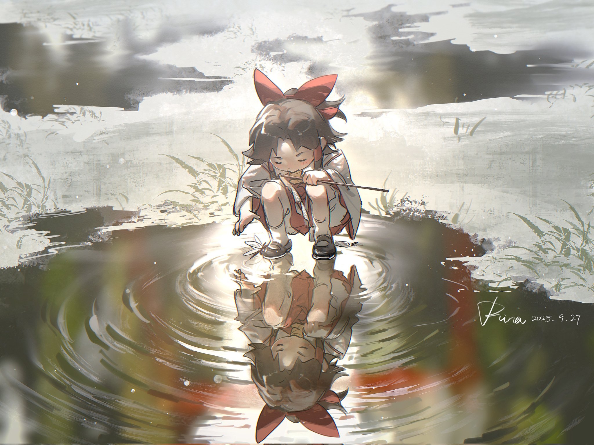 1girl aged_down aihara-rina ascot black_shoes bloomers bow bug chinese_commentary commentary dated day detached_sleeves dragonfly full_body gohei grass hair_bow hair_tubes hakurei_reimu highres holding holding_gohei insect long_sleeves looking_down outdoors puddle red_bow red_shirt red_skirt reflection reflective_liquid ripples shirt shoes signature skirt solo squatting touhou underwear water white_bloomers wide_sleeves yellow_ascot