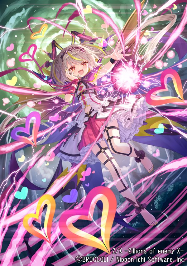 1girl barefoot blonde_hair clothing_cutout copyright_notice demon_wings dress electricity energy_ball fang frilled_dress frills grey_hair hair_ornament hairband hand_on_own_chin hastur_(z/x) heart multicolored_hair navel_cutout official_art open_mouth orange_eyes outstretched_arm purple_hairband solo tadokoro_teppei white_dress wings wristband z/x