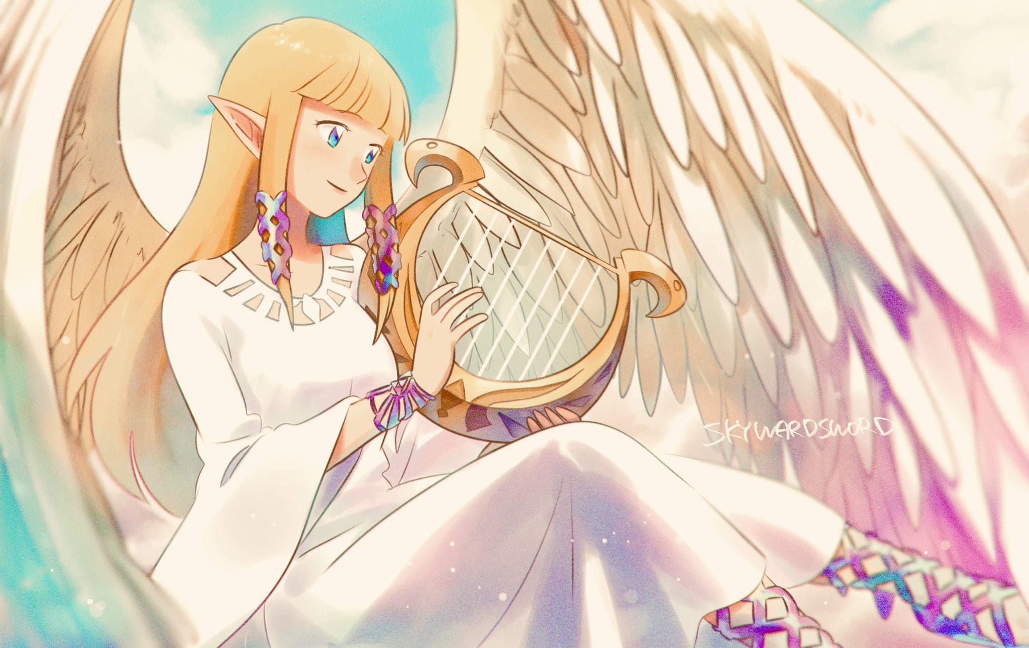 1girl angel_wings blonde_hair blue_eyes blunt_bangs breasts closed_mouth copyright_name dress feathered_wings hair_ribbon highres holding_harp long_dress long_hair long_sleeves medium_breasts nintendo pointy_ears princess_zelda ribbon sidelocks smile solo the_legend_of_zelda the_legend_of_zelda:_skyward_sword tkdnlerkdtpfsut white_dress white_wings wide_sleeves wings wrist_ribbon