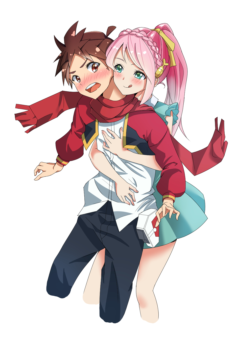 1boy 1girl age_difference amakusa_kyo anima_gear aqua_dress aqua_eyes belt_pouch black_pants braid brown_eyes brown_hair child closed_mouth crown_braid dress hair_ornament hair_ribbon high_ponytail highres hug hug_from_behind jacket long_hair mikami_makoto_(makot0_01) momiji_sakura onee-shota open_clothes open_jacket open_mouth pants pink_hair ponytail pouch red_jacket red_scarf ribbon scarf shirt short_hair tongue tongue_out white_shirt yellow_ribbon