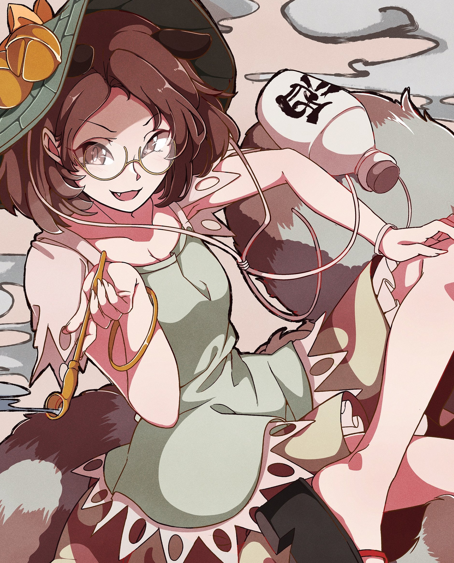 1girl :3 :d animal_ears bottle bracelet brown_eyes brown_hair brown_skirt collarbone commentary_request fang fingernails frilled_skirt frills furrowed_brow futatsuiwa_mamizou gokuu_(acoloredpencil) gold_bracelet green_hat green_shirt hand_on_own_knee hat hat_belt highres holding holding_smoking_pipe jewelry kiseru looking_at_viewer medium_hair multicolored_skirt no_socks okobo open_mouth platform_sandals raccoon_ears raccoon_tail sake_bottle sandals semi-rimless_eyewear shirt skirt smile smoke smoke_trail smoking_pipe solo tail tanuki tokkuri touhou under-rim_eyewear