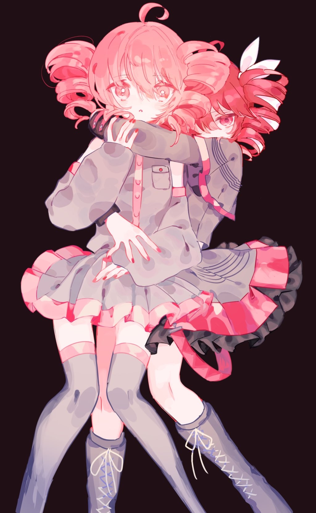2girls :o \||/ ahoge bare_shoulders behind_another black_background boots bow breasts bright_pupils buttons chinese_commentary commentary detached_sleeves double-parted_bangs drill_hair dual_persona feet_out_of_frame frilled_skirt frilled_sleeves frills grey_boots grey_shirt grey_skirt grey_sleeves grey_thighhighs hair_between_eyes hair_bow hand_on_another's_arm highres hug hug_from_behind kasane_teto kasane_teto_(sv) kasane_teto_(utau) knee_boots knees_together_feet_apart lace-up_boots layered_sleeves long_sleeves looking_at_viewer miniskirt multiple_girls musical_staff musical_staff_print nail_polish parted_lips pleated_skirt red_eyes red_hair red_nails red_trim shirt short_hair short_over_long_sleeves short_sleeves simple_background skirt sleeveless sleeveless_shirt small_breasts standing sucre_(236rm) synthesizer_v thighhighs twin_drills utau white_bow white_pupils zettai_ryouiki