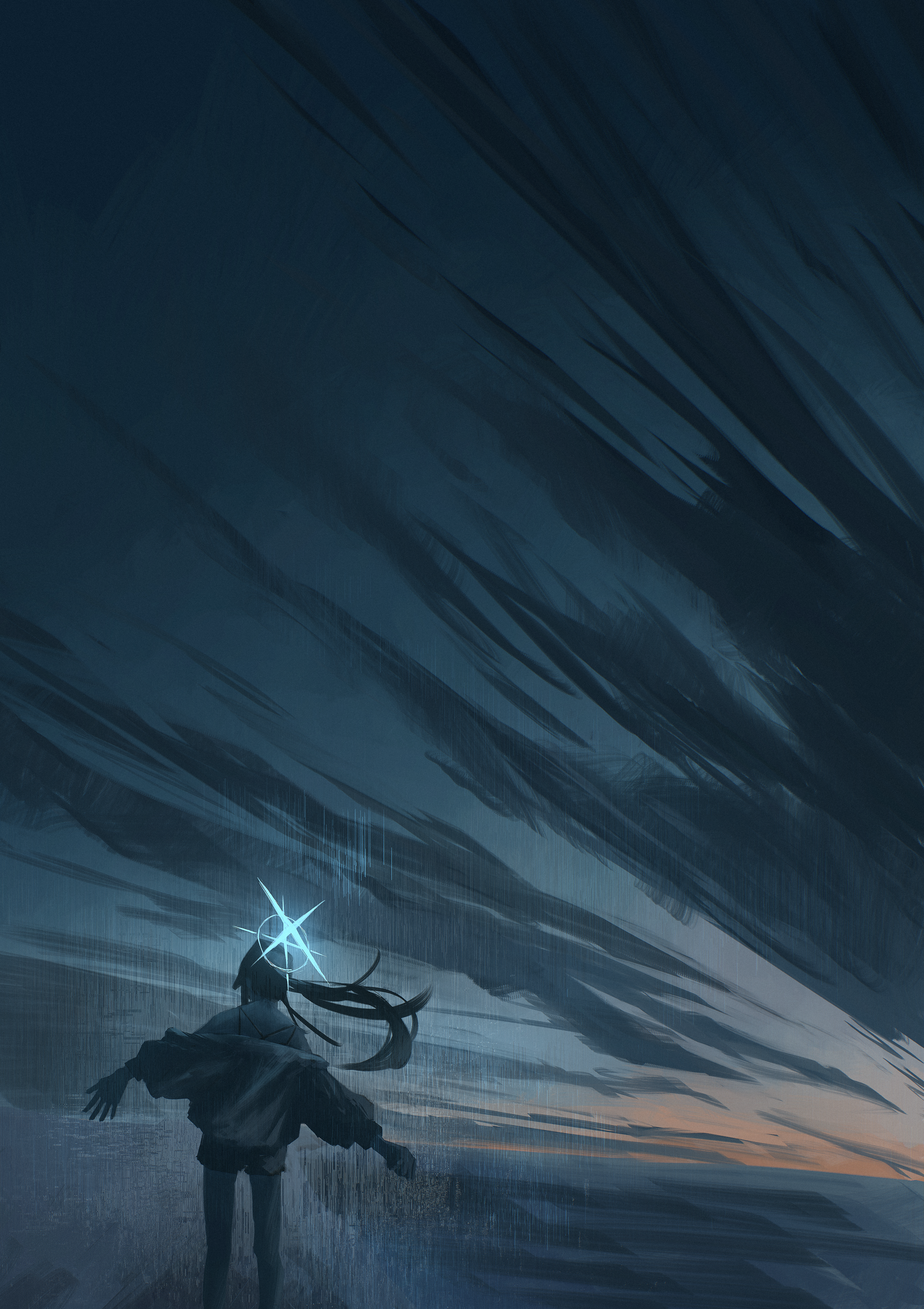 1girl absurdres black_hair black_shorts black_tank_top blue_archive blue_halo clenched_hand from_behind grey_jacket halo highres jacket kani_etizen03 long_hair night outstretched_arms rain saori_(blue_archive) saori_(swimsuit)_(blue_archive) scenery shorts sky solo spread_arms tank_top
