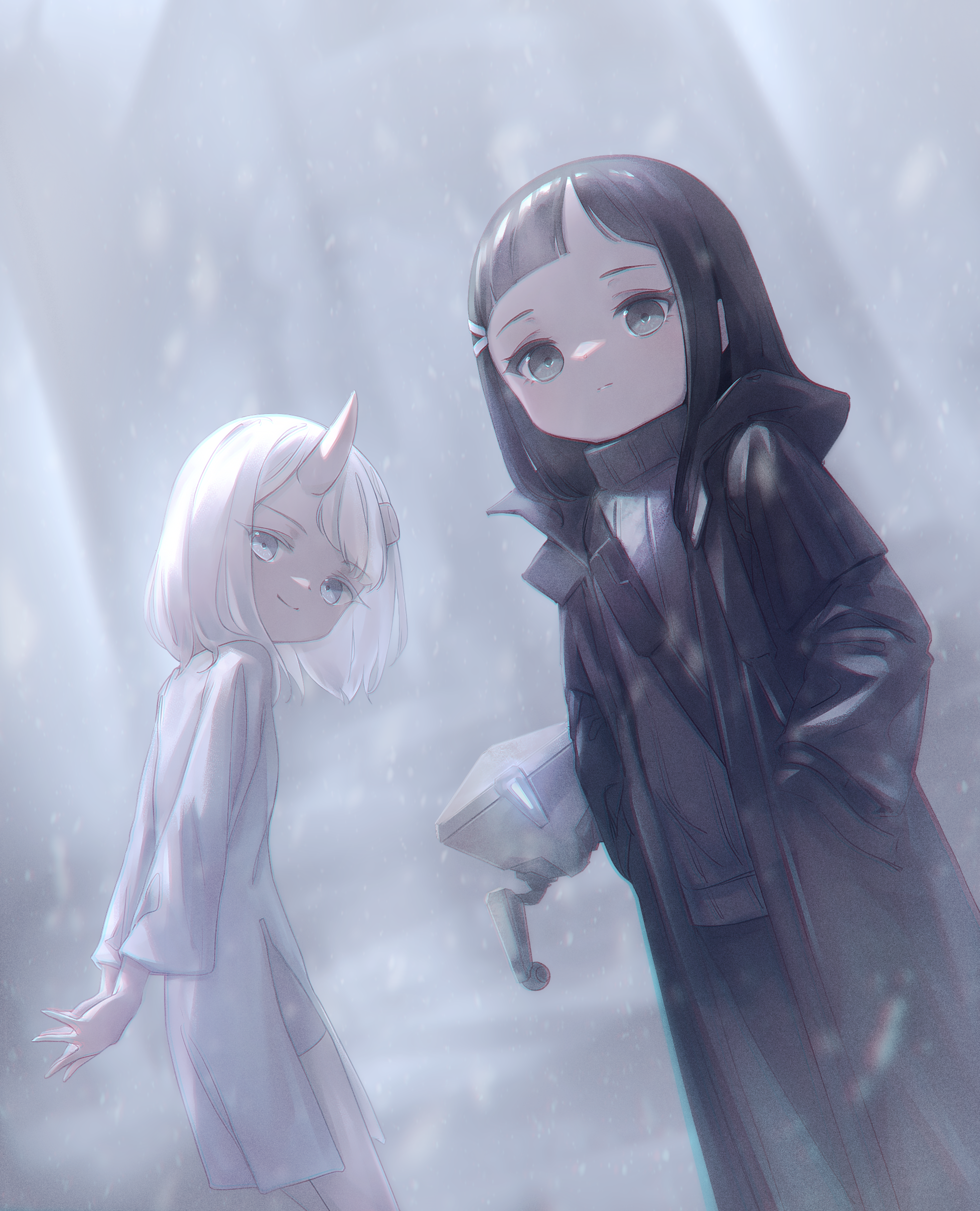 2girls absurdres black_hair broken_horn captaintcher coat dress flat_chest highres horns long_hair looking_at_viewer multiple_girls oni original robot science_fiction short_hair smile white_hair