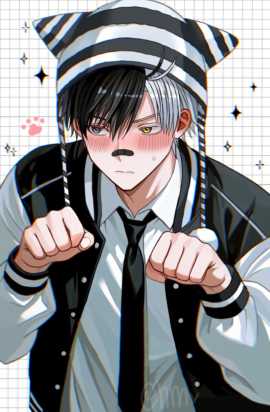 1boy bandaid bandaid_on_face bandaid_on_nose black_hair black_jacket black_necktie blush closed_mouth grey_eyes heterochromia highres hyohls2_(hamao3o) jacket long_sleeves male_focus multicolored_hair multicolored_jacket necktie sakura_haruka_(wind_breaker) shirt short_hair solo split-color_hair striped_hat two-tone_hair white_hair white_jacket white_shirt wind_breaker_(nii_satoru) yellow_eyes