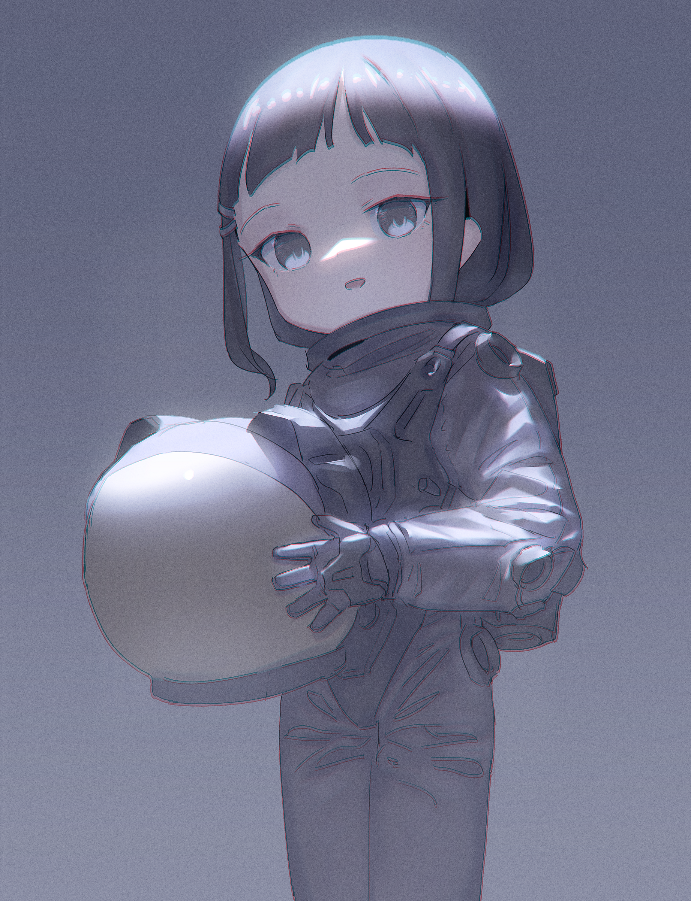 1girl absurdres astronaut black_hair captaintcher grey_eyes helmet highres holding holding_unworn_helmet looking_at_viewer original pointy_ears smile solo spacesuit unworn_headwear unworn_helmet