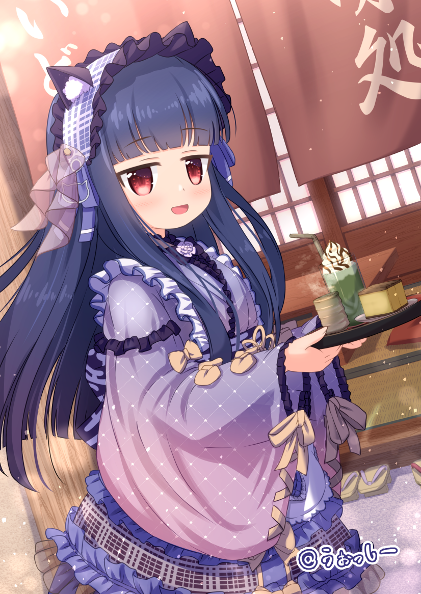 1girl animal_ears cat_ears frills holding holding_tray idolmaster idolmaster_cinderella_girls japanese_clothes long_hair looking_at_viewer red_eyes sajo_yukimi smile solo tray uosshi
