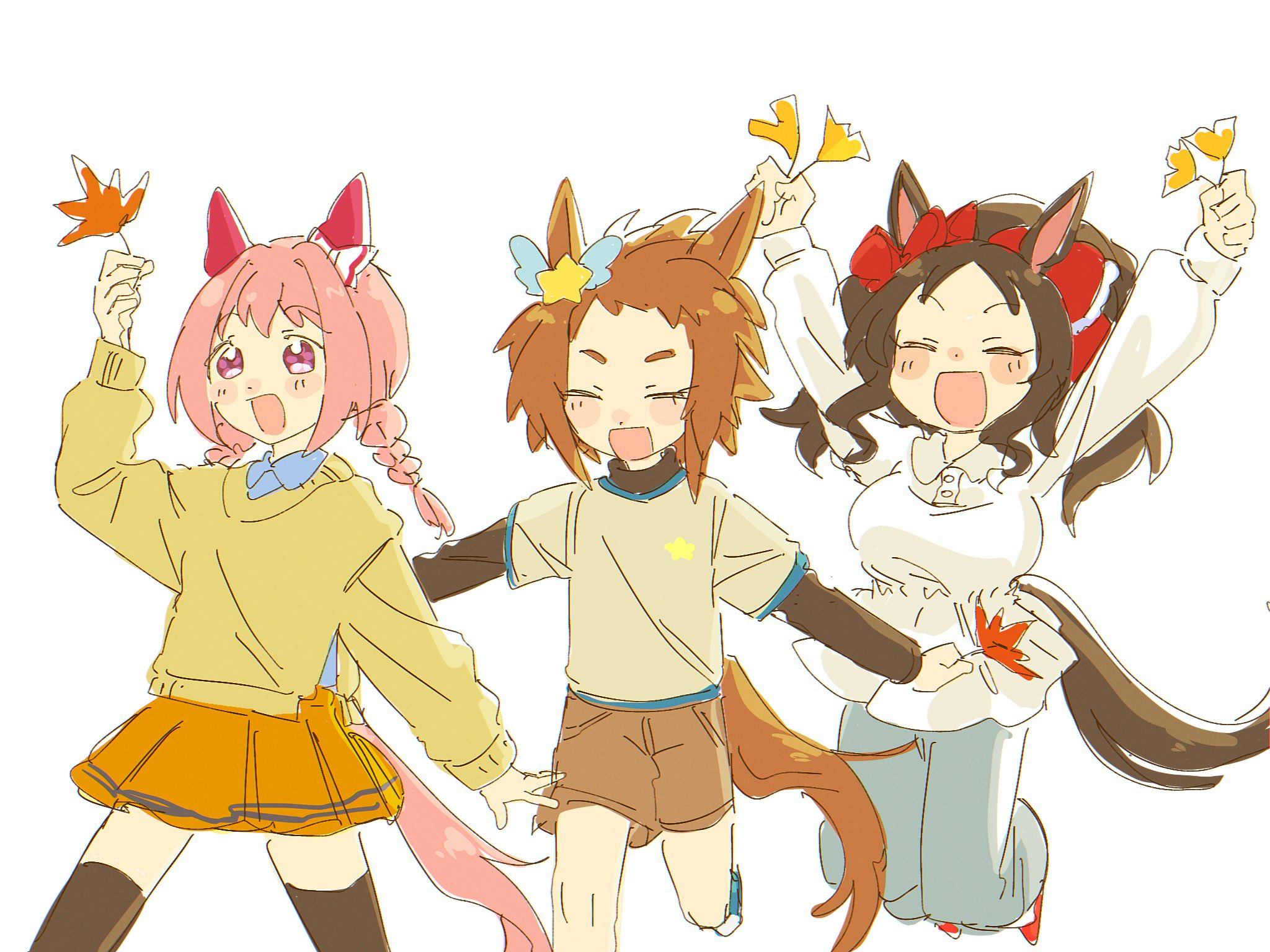3girls animal_ears autumn_leaves biko_pegasus_(umamusume) black_hair black_shirt black_thighhighs blue_pants blush bow braid breasts brown_hair brown_shorts closed_eyes dododocw ear_bow ear_covers ear_ornament flower-shaped_pupils flower_in_eye hair_ornament haru_urara_(umamusume) highres holding holding_leaf horse_ears horse_girl horse_tail large_breasts leaf long_hair long_sleeves marvelous_sunday_(umamusume) multiple_girls open_mouth orange_skirt pants pink_eyes pink_hair purple_eyes shirt short_hair shorts simple_background skirt smile star_(symbol) sweater symbol-shaped_pupils symbol_in_eye tail thighhighs twin_braids umamusume undershirt white_background white_shirt wing_ornament yellow_sweater