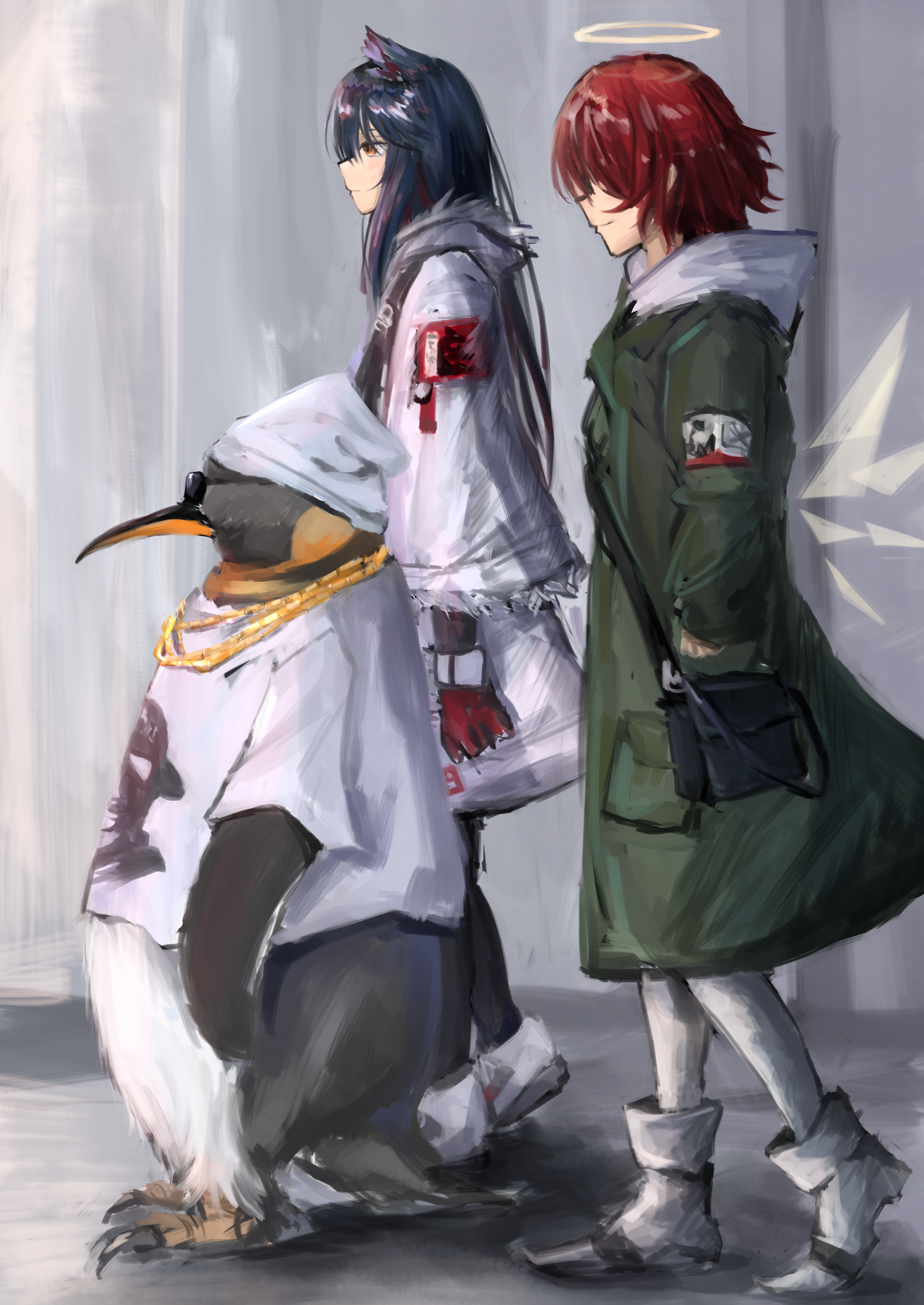 1boy 2girls absurdres animal_ears arknights arms_at_sides bag beanie bird black_leggings blue_hair chain coat commentary detached_wings emperor_(arknights) energy_wings english_commentary exusiai_(arknights) from_side full_body fuyunoyuki gloves gold_chain gold_necklace green_coat grey_leggings grey_shoes halo hat highres jewelry leggings long_hair looking_ahead mixed-language_commentary multiple_girls multiple_necklaces necklace penguin penguin_logistics_(arknights) profile red_gloves red_hair shirt shoes short_hair shoulder_bag sketch standing sunglasses texas_(arknights) traditional_halo walking white_coat white_hat white_leggings white_shirt white_shoes wings wolf_ears wolf_girl yellow_eyes